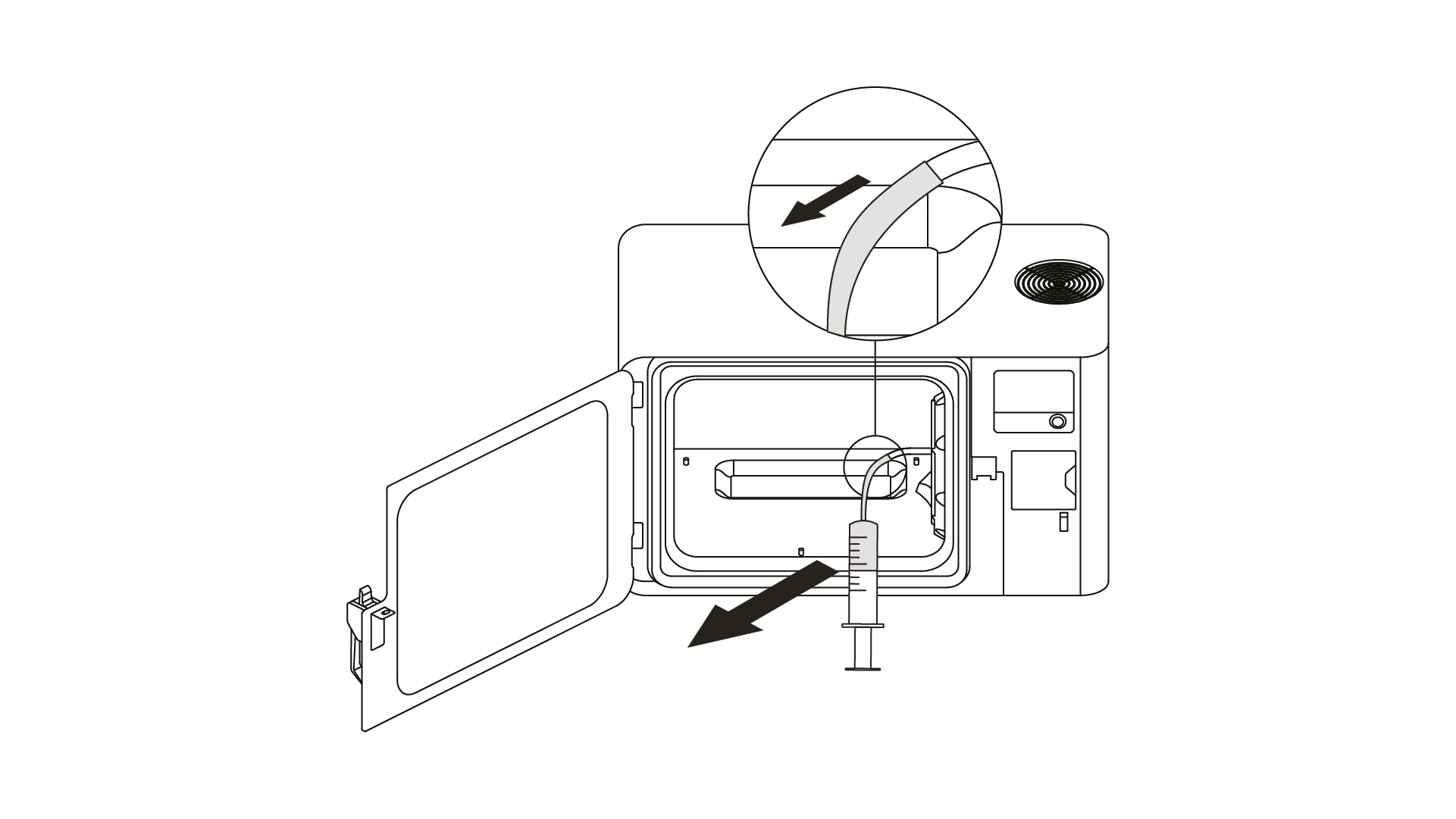 2. Put the syringe tube on the drain tube inside the device and start the procedure of emptying the tank. Select Tools and Empty the solvent system.
