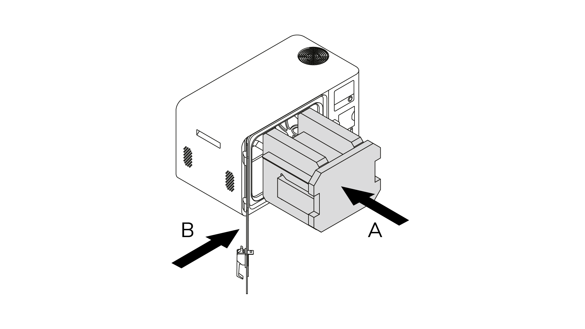 1. Place the protective foam with the platform inside the chamber (A). Close the door (B).