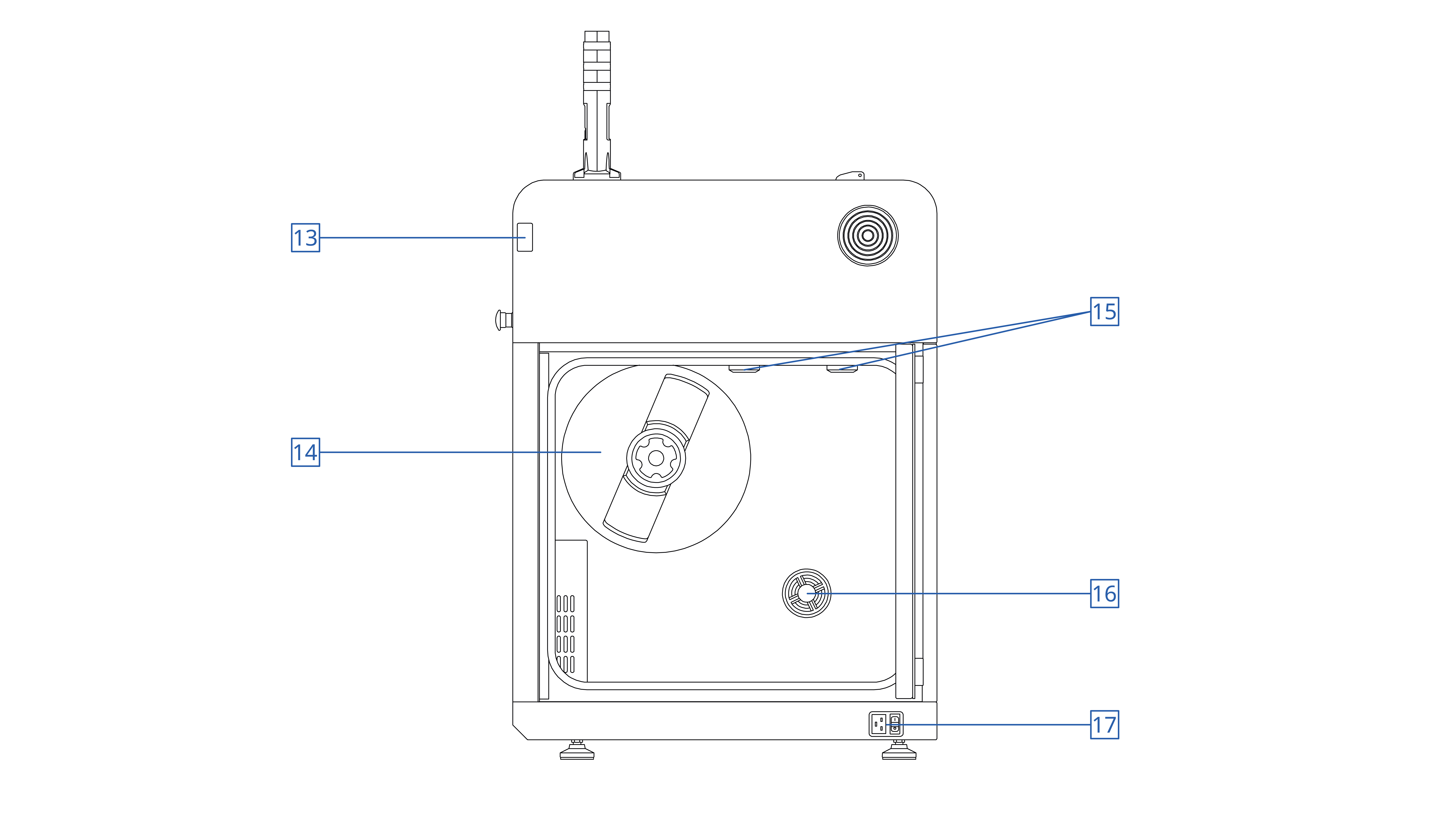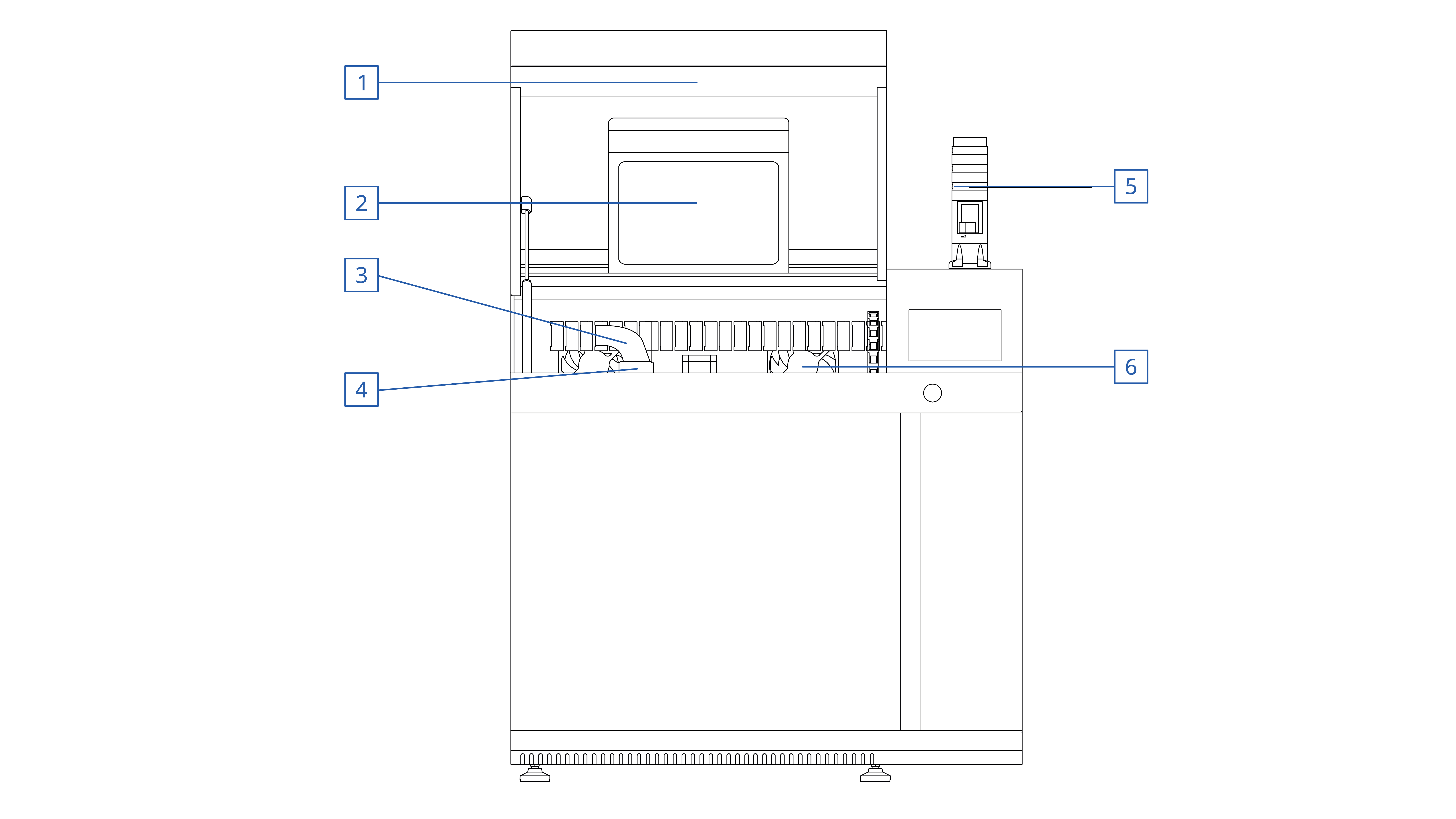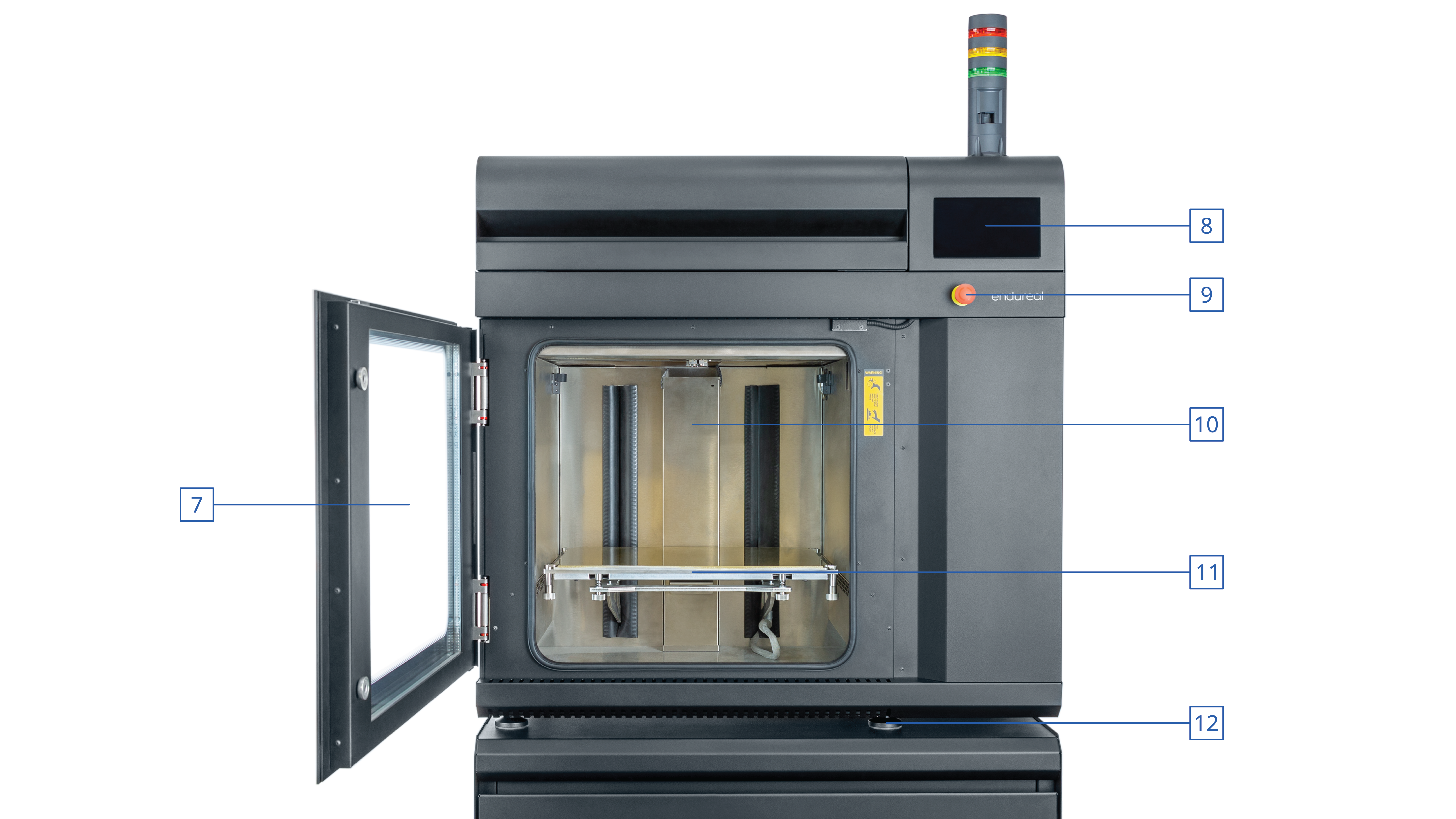 1 Front View 1 2 Open Lid Lid Filters (Carbon & HEPA) Extruder Cable Extruder LED Tower Main Fans (Left & Right) 1 2 Open Main Chamber Front Door Touchscreen Emergency Button Waste Container Platform Rubber Legs