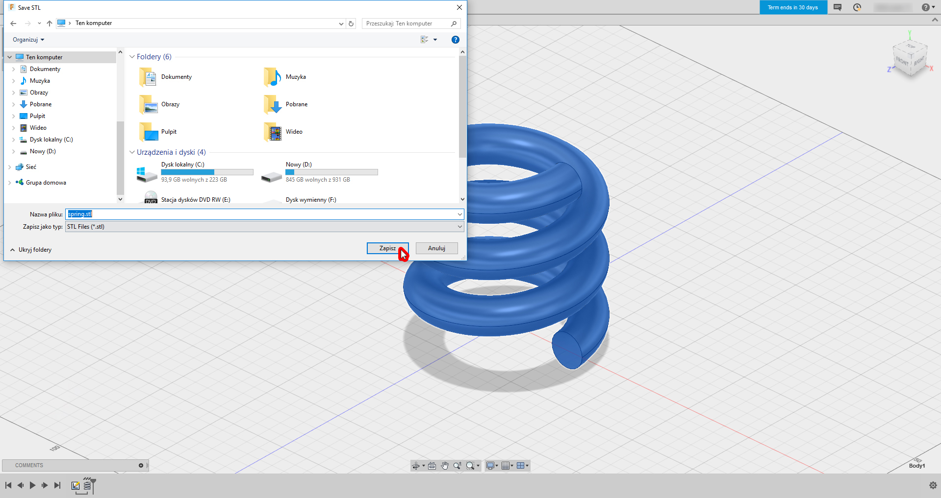 To export the model as an STL file, click the left mouse button select it, and click Export button located on the left. In the pop-up window, select which elements should be included in the file, and choose .STL.