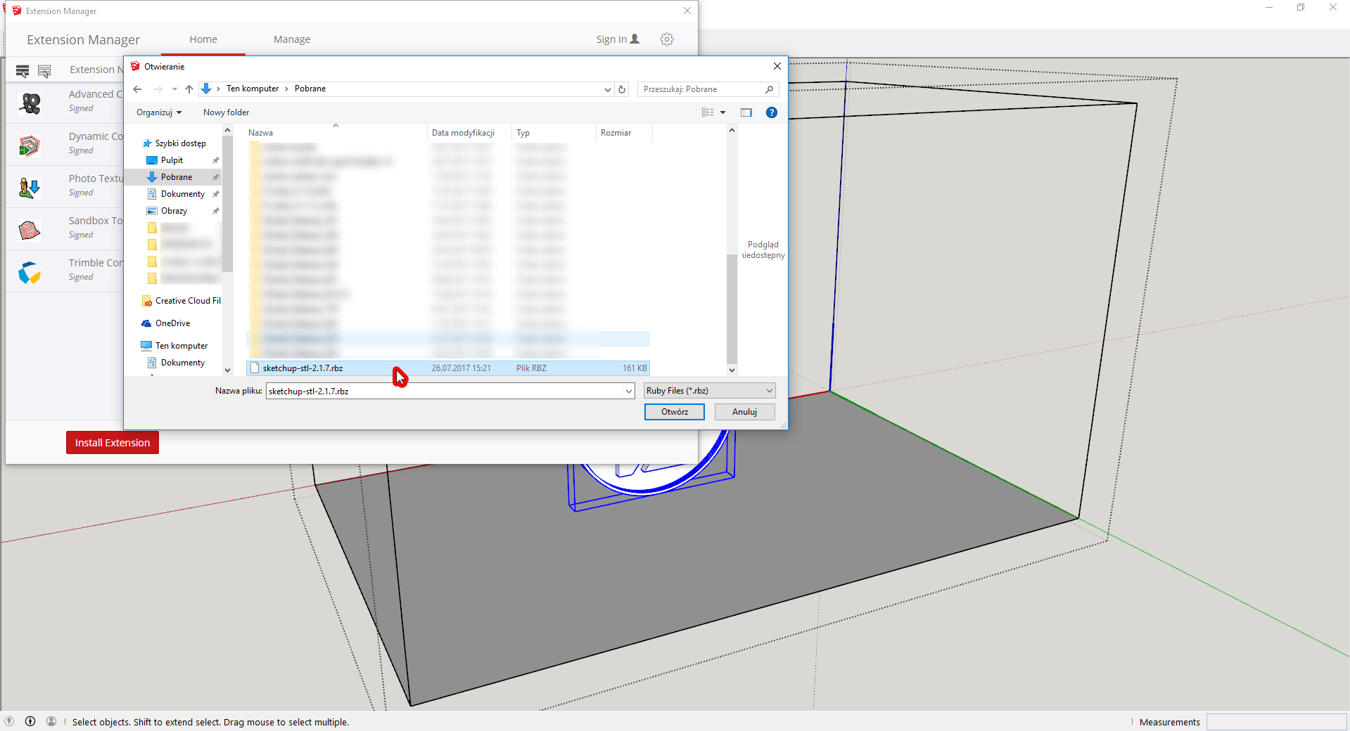From the menu bar in Sketchup, select Extension Manager. In the pop-up window, click Install Extension. From the drop-down list, select the plug-in you’ve just downloaded, and click Open. The plug-in will be installed automatically.