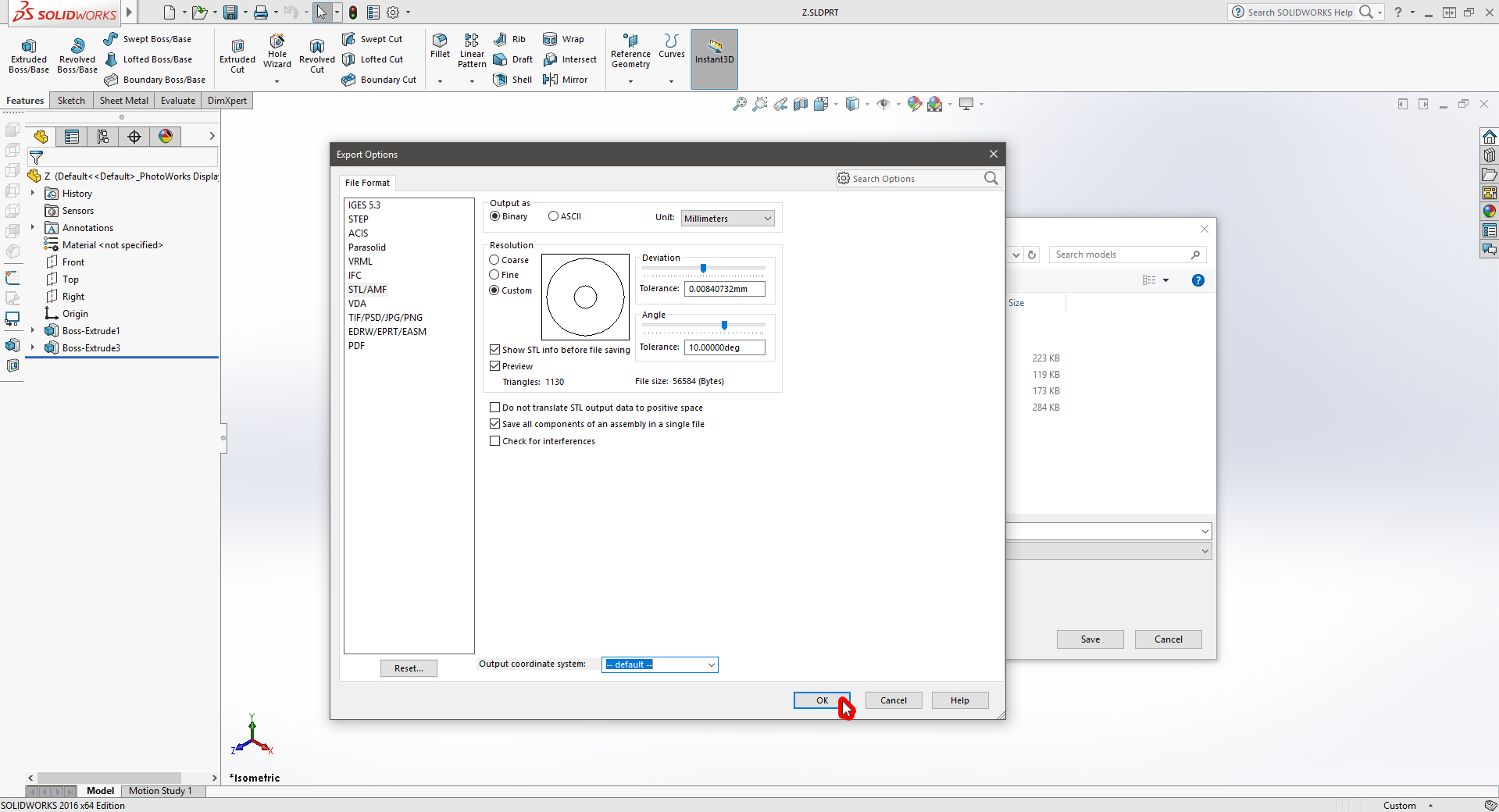 From the menu bar, select File > Save as. Next, choose a location for your file, and from the Save as type drop-down list, select STL (*.stl), and click Save. If you want to increase the number of triangles, before you click Save, select Advanced and adjust the Deviation and Angle sliders to achieve the desired results.