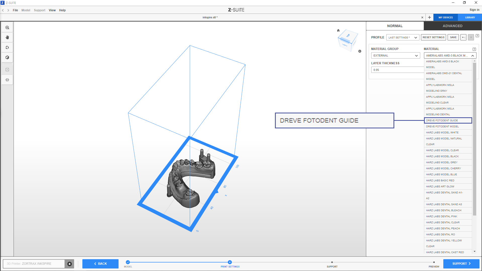 From the 2.15.0 Z-SUITE update, it is possible to print with resins delivered by Dreve. The update includes printing profiles for FotoDent® model and FotoDent® guide resins, which are suitable for dental applications. The FotoDent model resin can be used in orthodontics and prosthetics, allowing users to produce stable models resistant to moisture and abrasion. The FotoDent guide resin is dedicated for printing biocompatible dental drill guides with high dimensional accuracy. This article provides details about the resins’ features and instructions for the printing process.