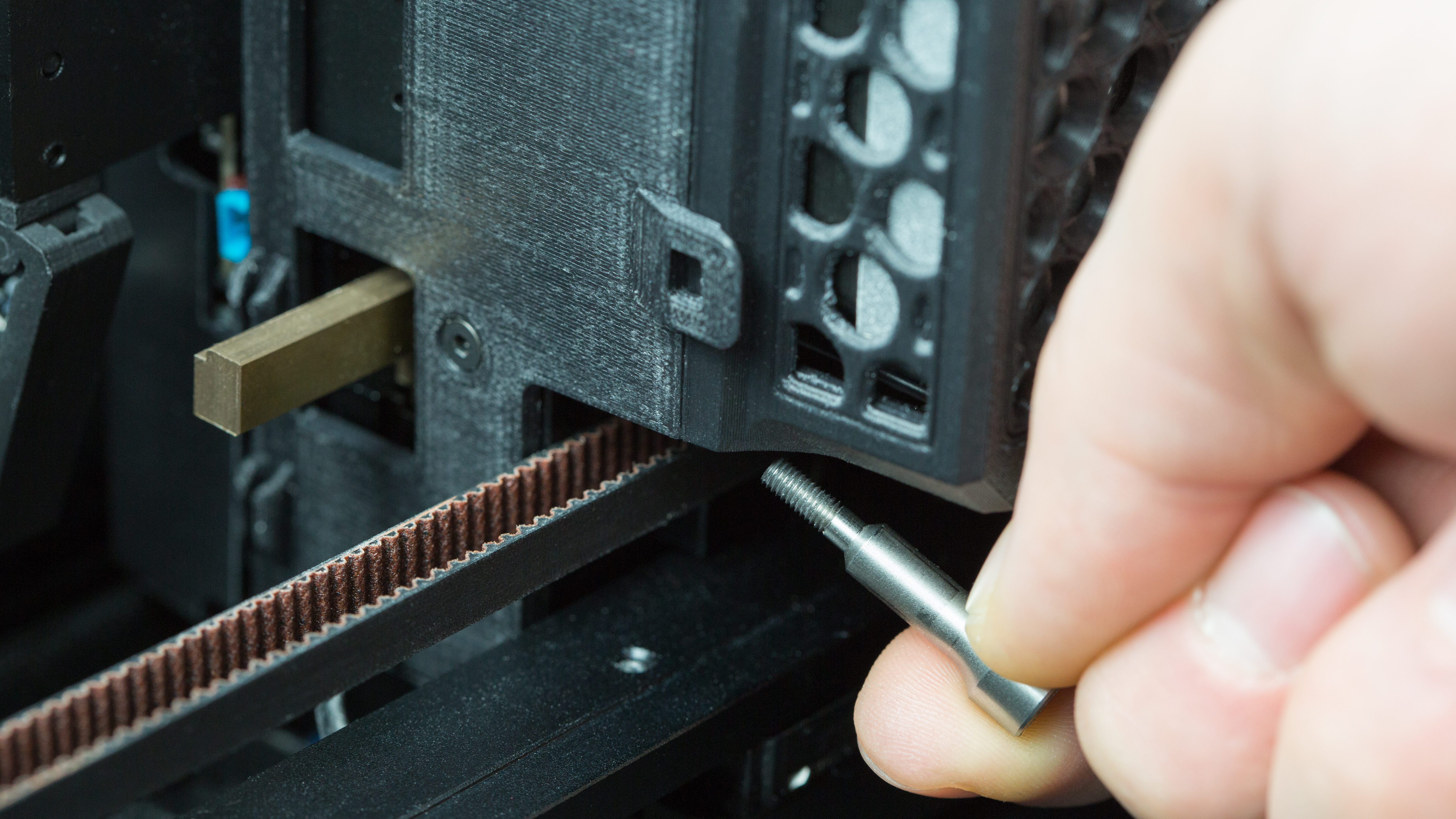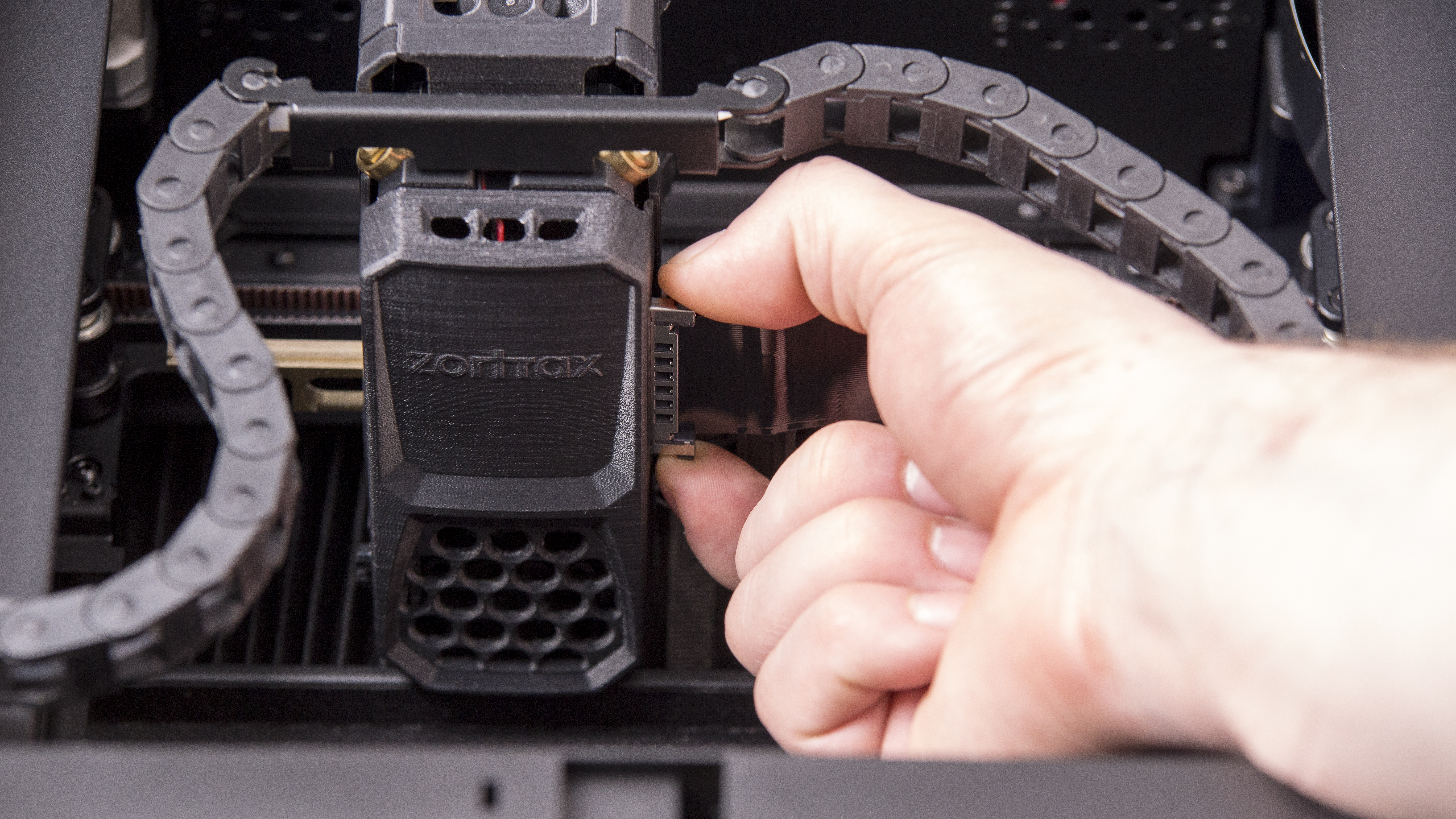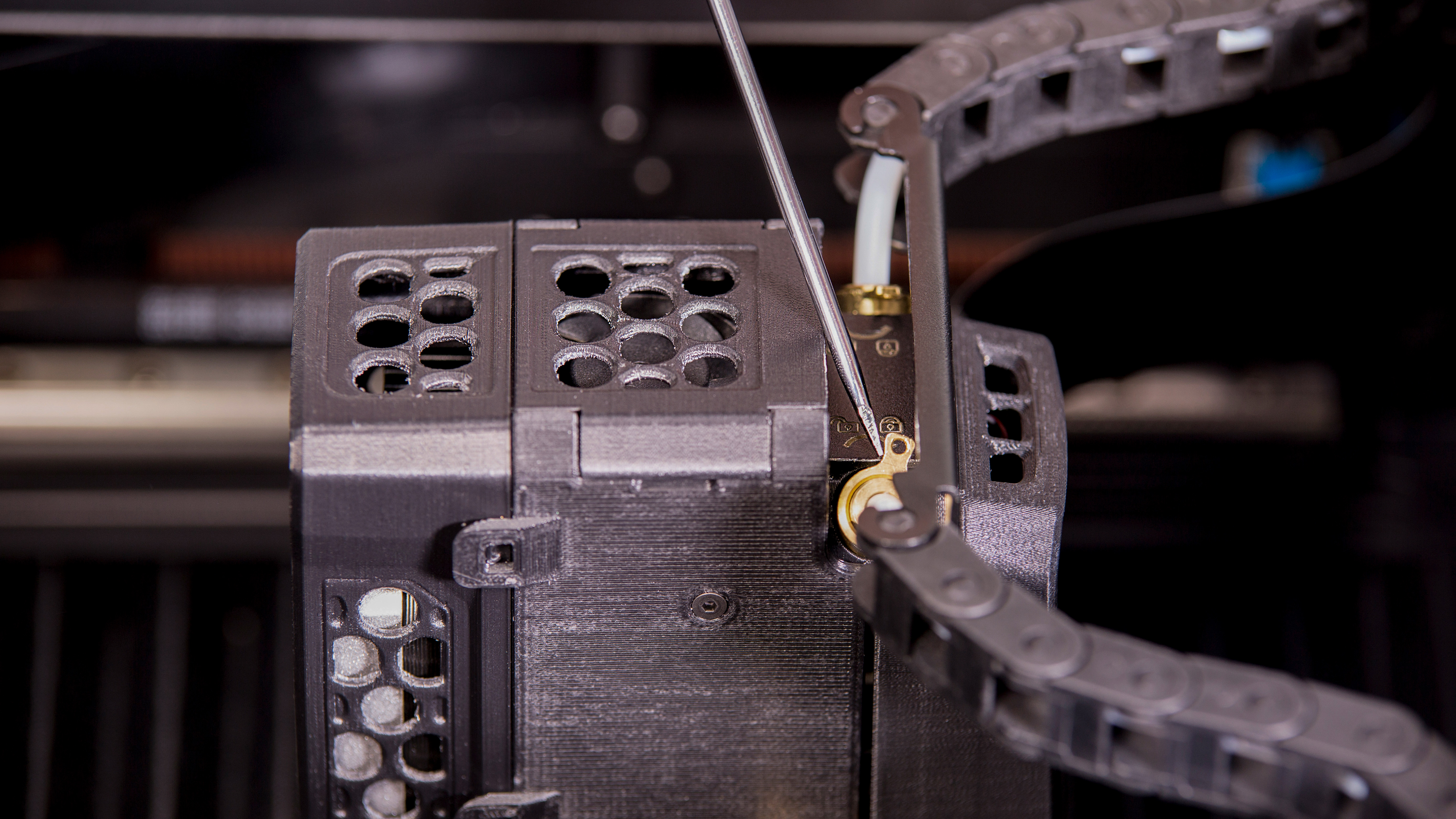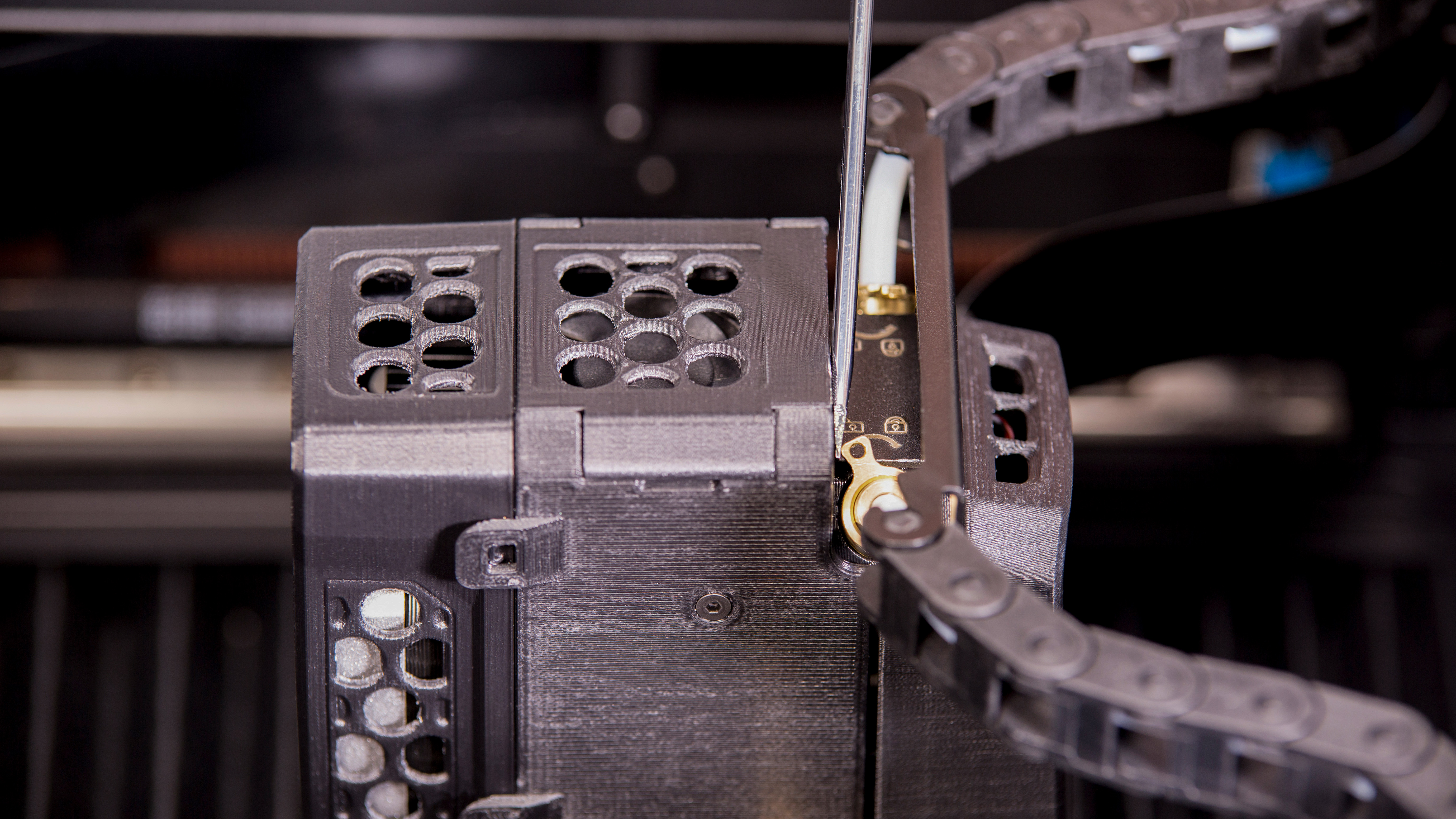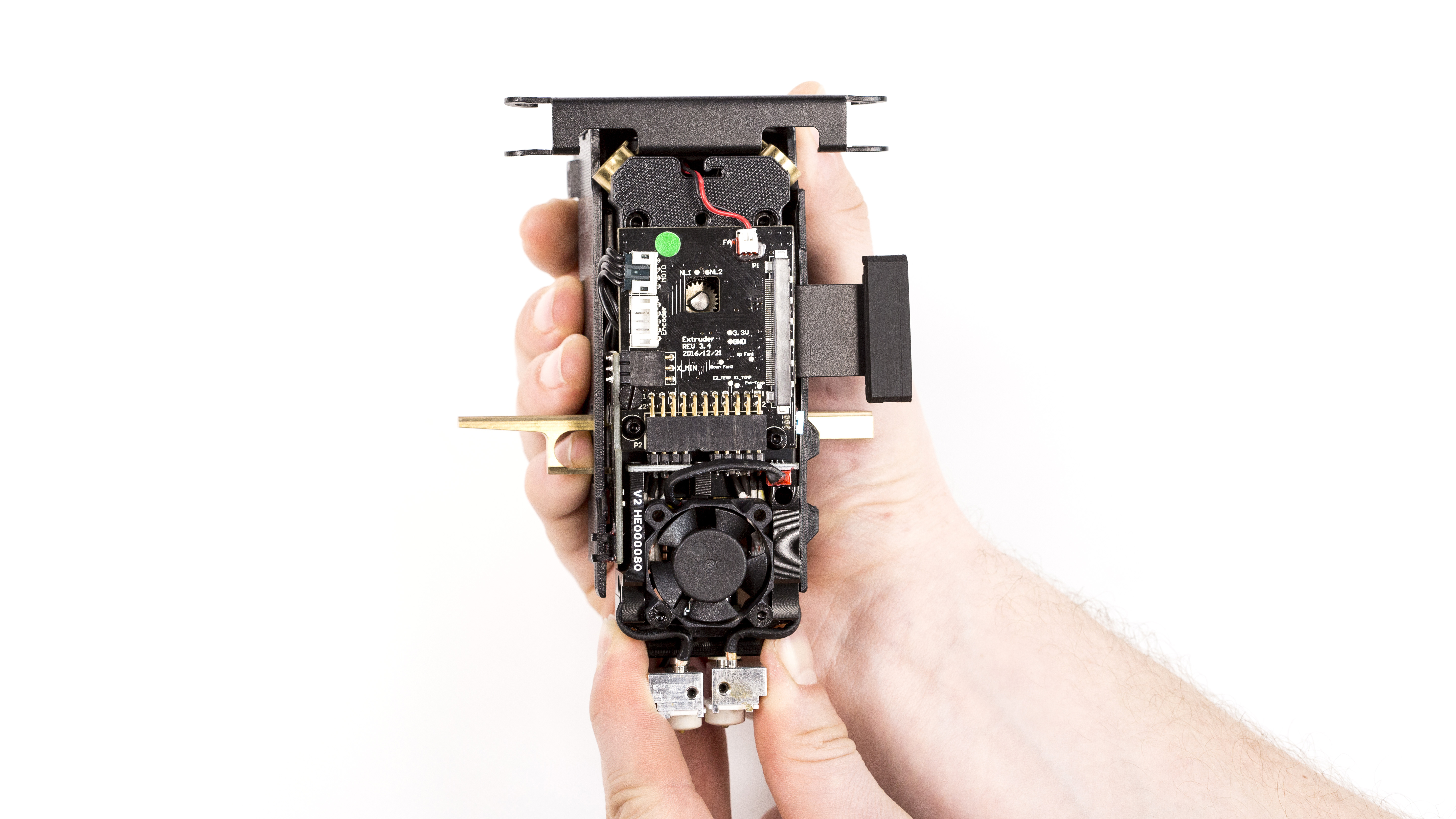 The hotend module consists of two separate hotends, one extruding the model material and the other extruding the support material. It is also responsible for heating and melting the materials as well as for maintaining the proper temperature of the materials during the whole printing process. Therefore, if the whole module does not heat up or does not extrude either of the materials, or the material residues accumulate around the hotends and are difficult to remove, the hotend module needs to be replaced.