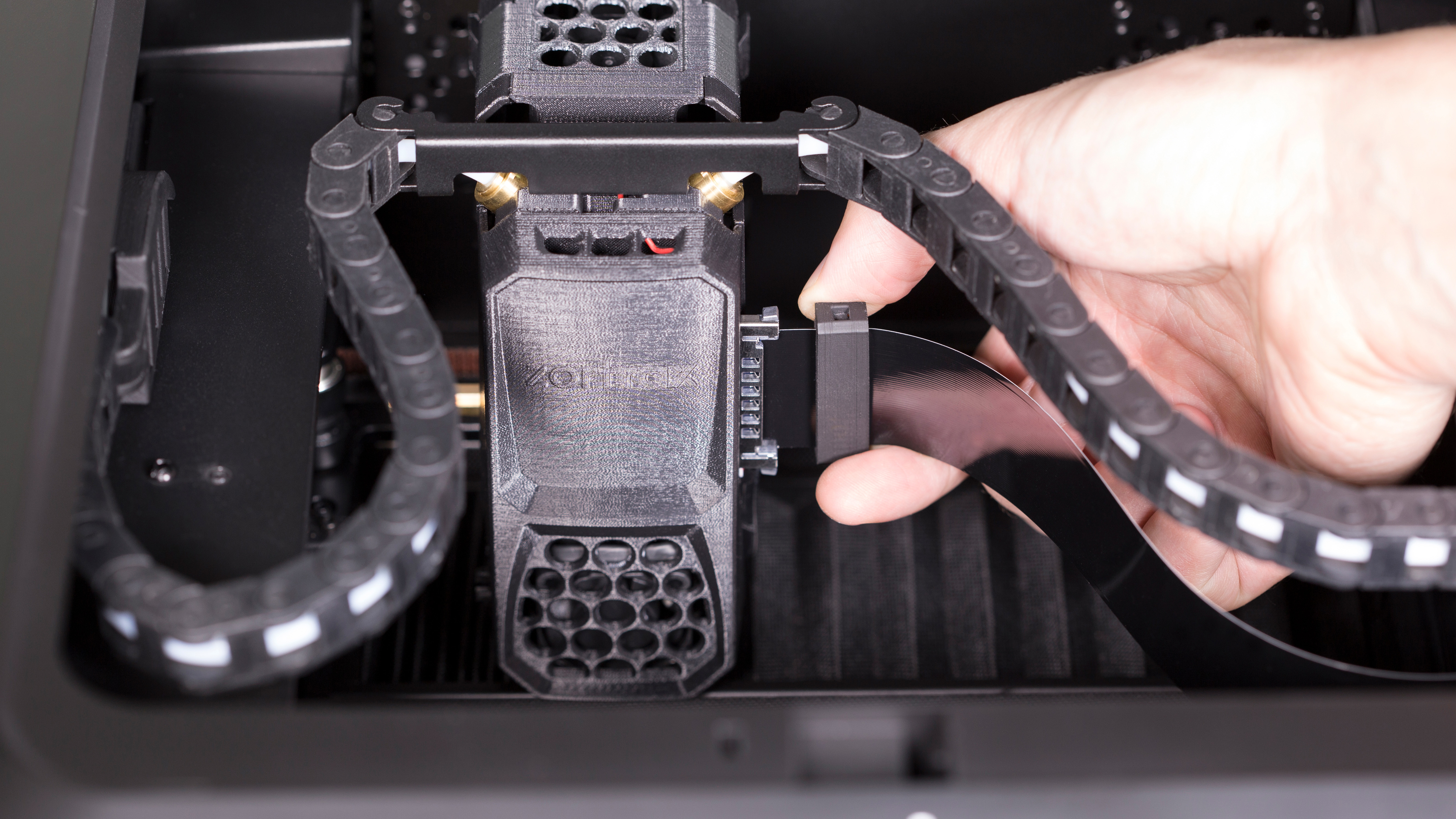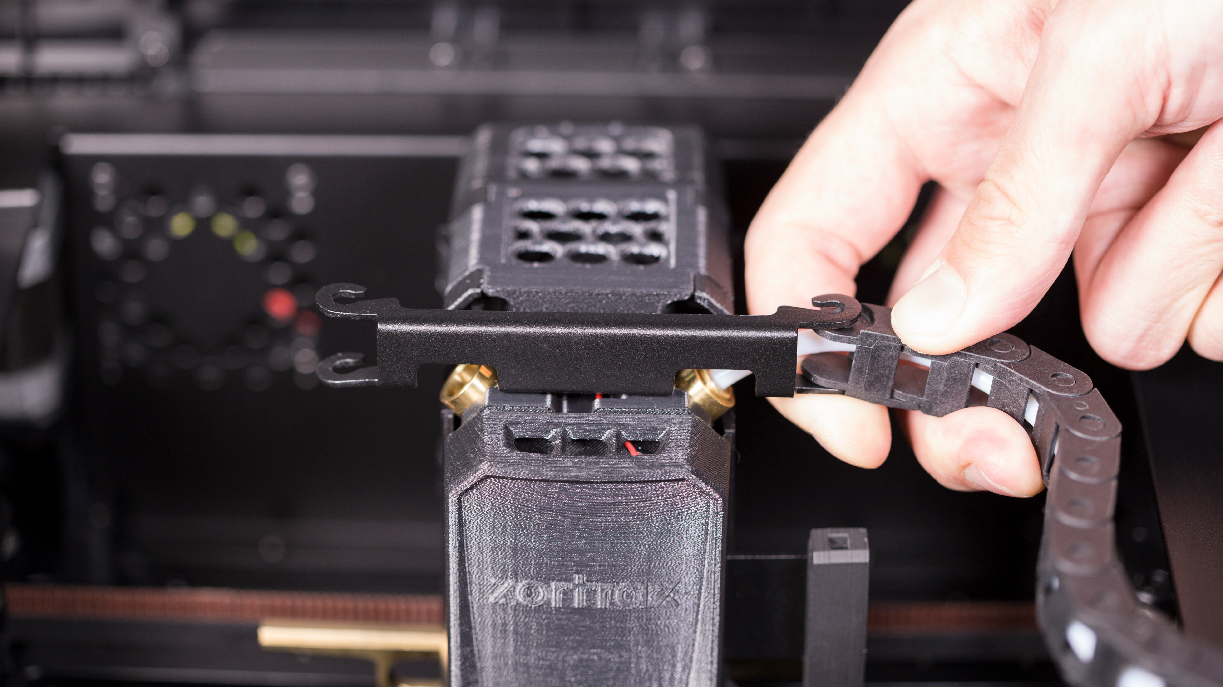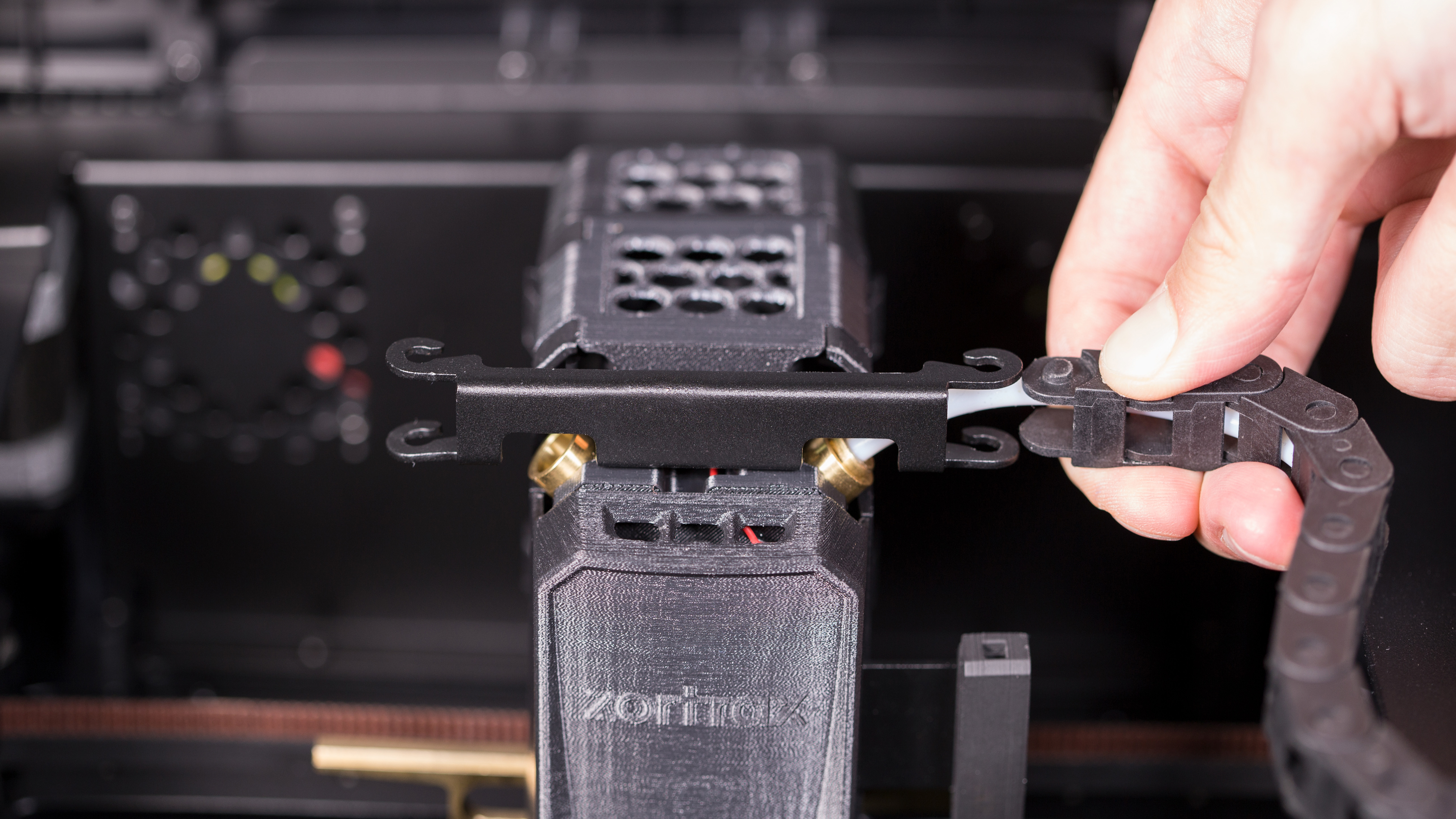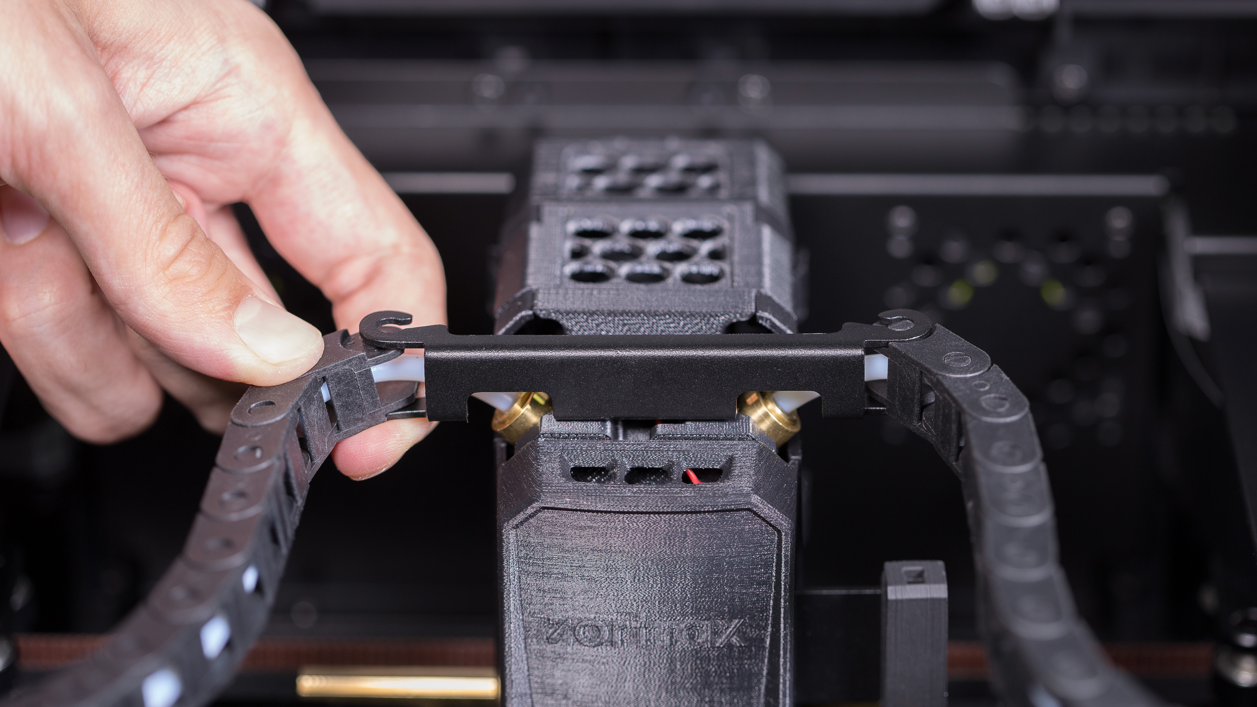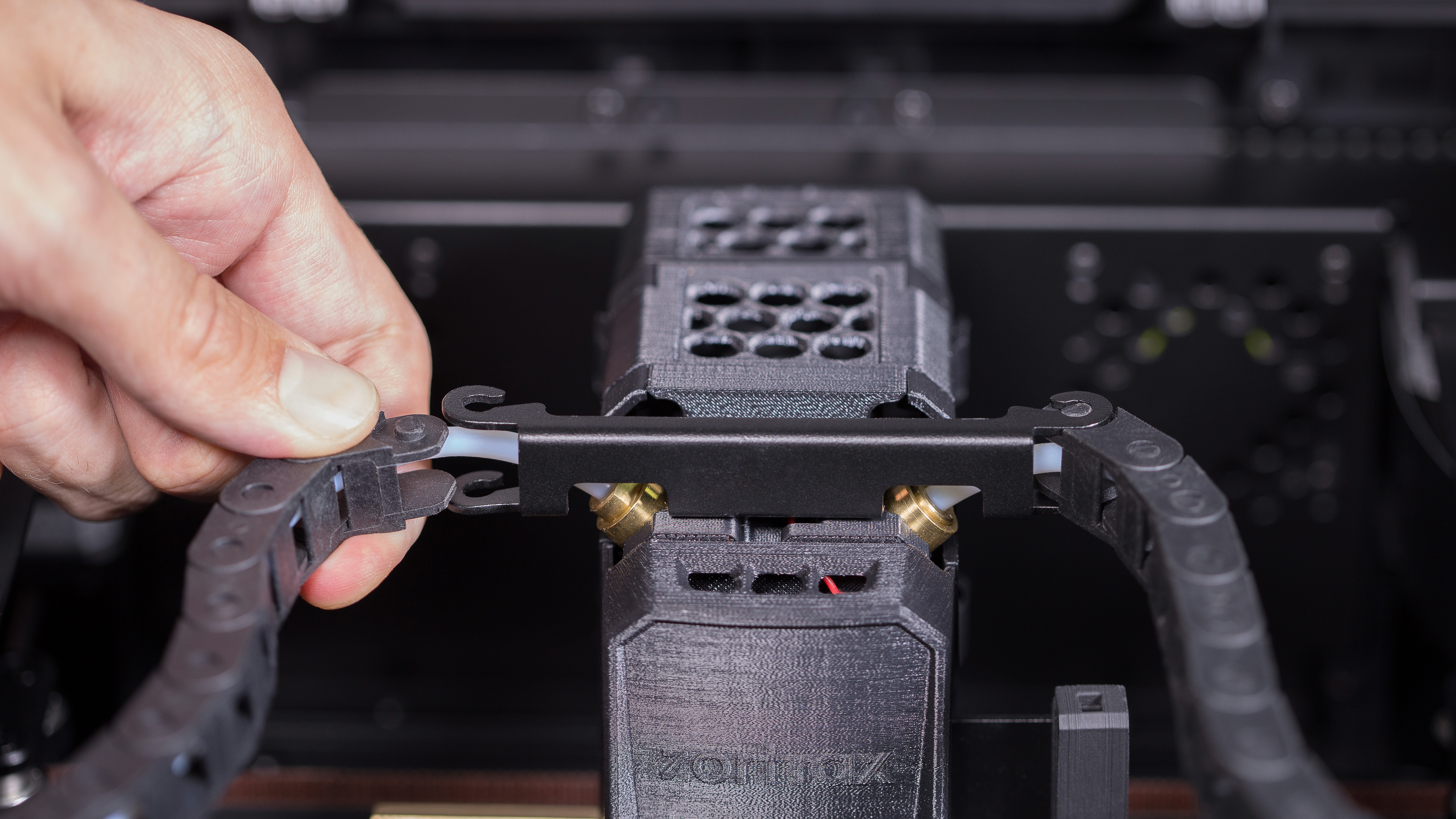 Attach the material guide tube to the extruder. Next, install the outer material guide gently in its place. Repeat this step with the other material guide.