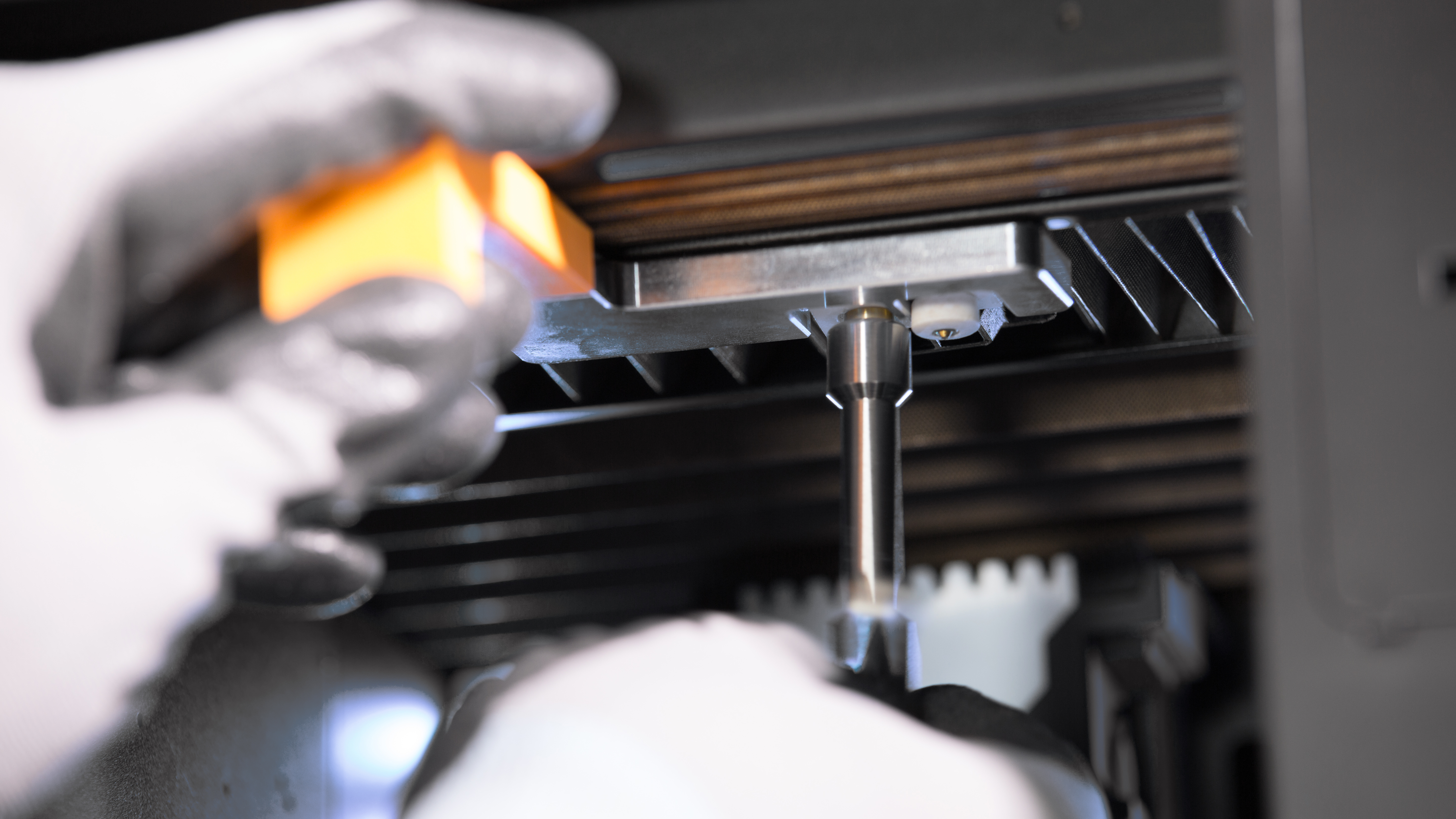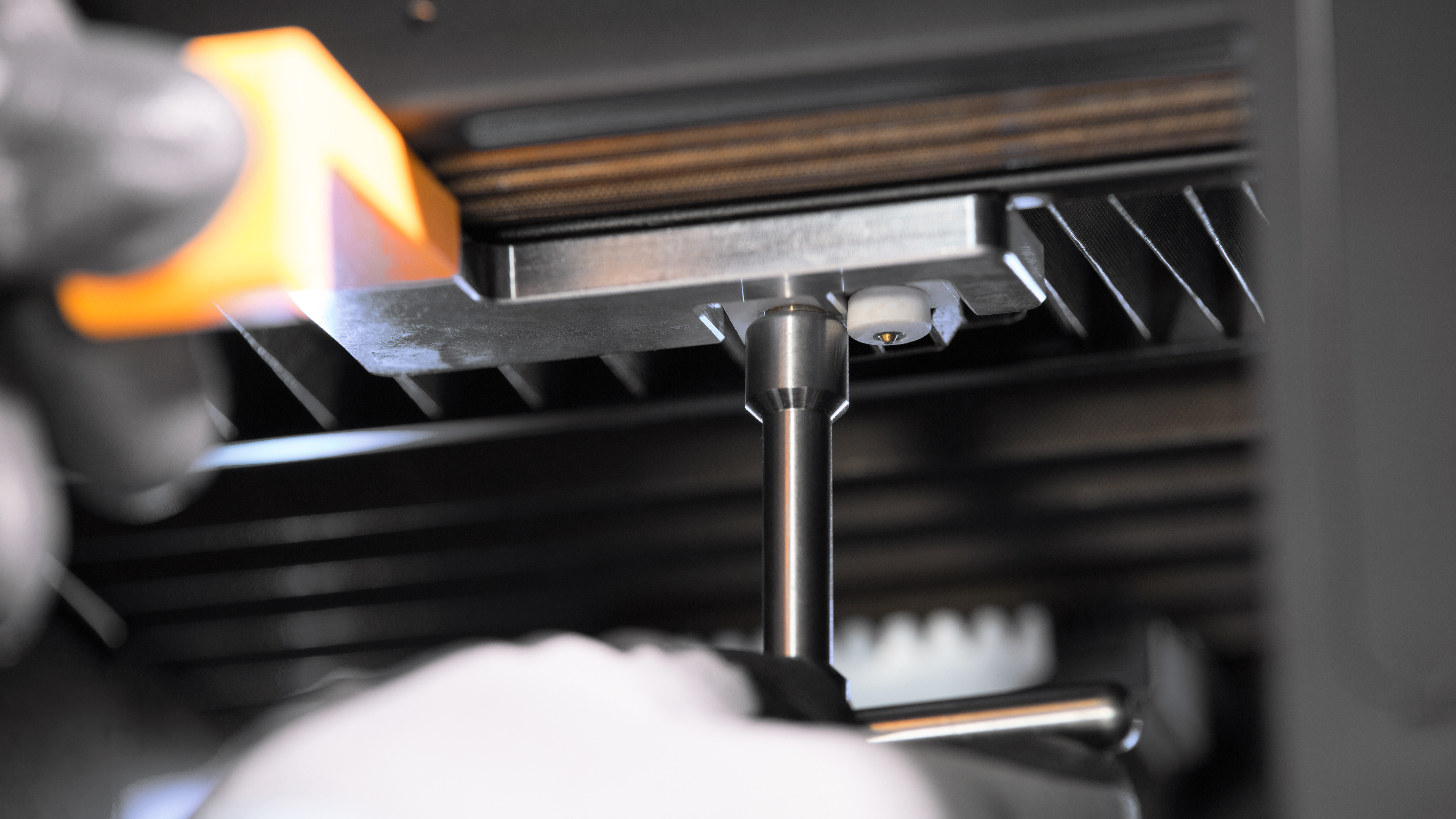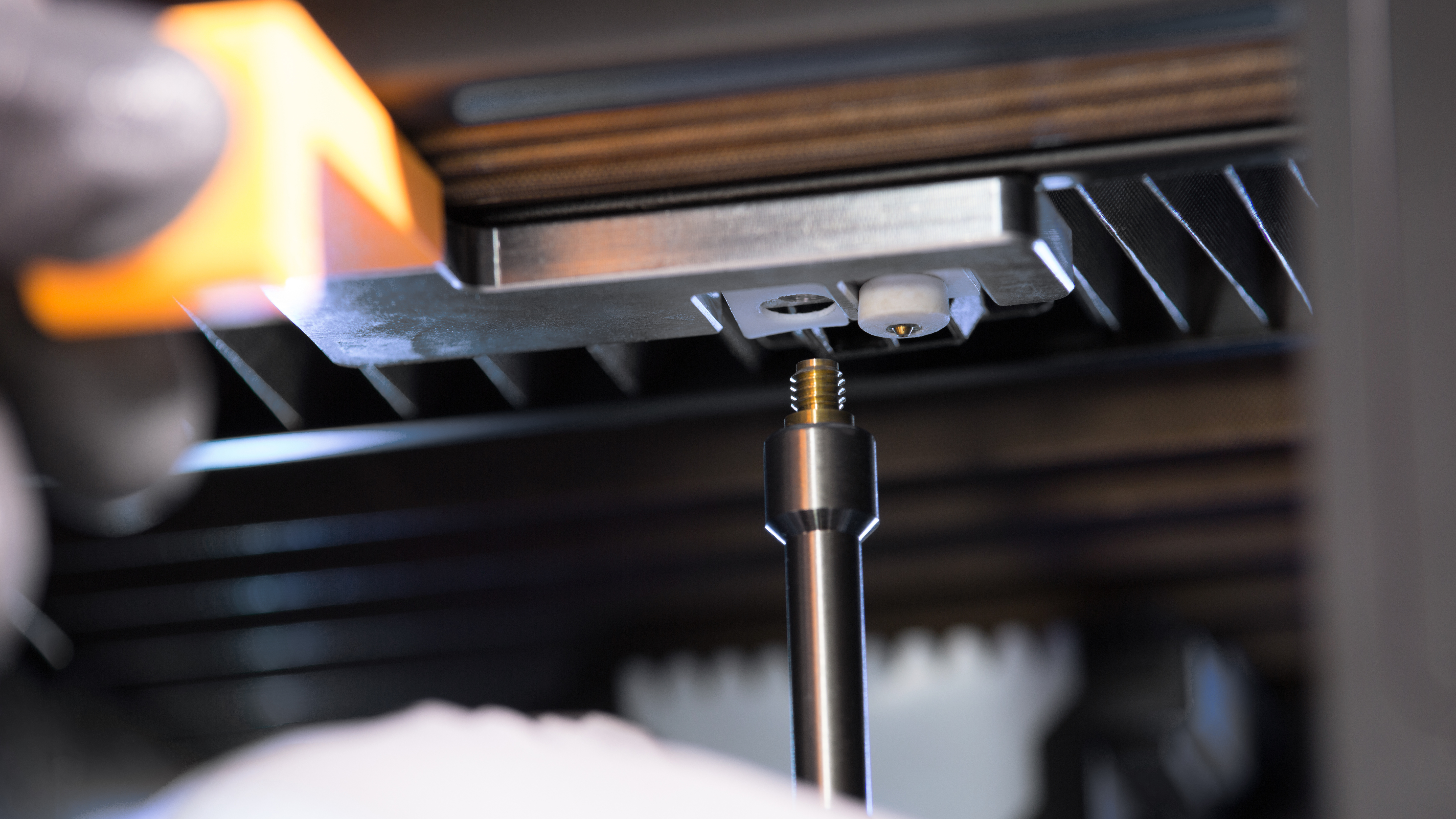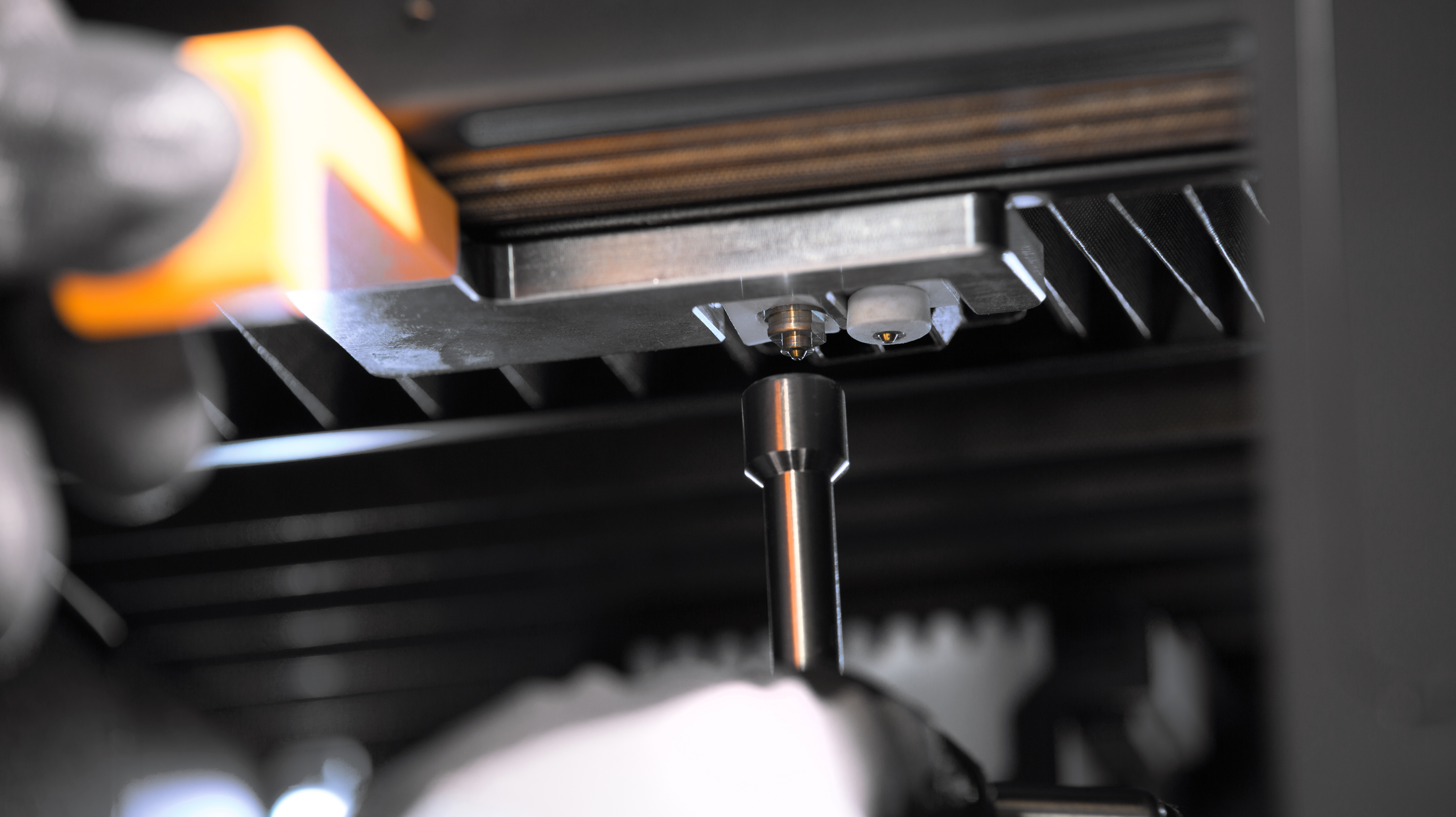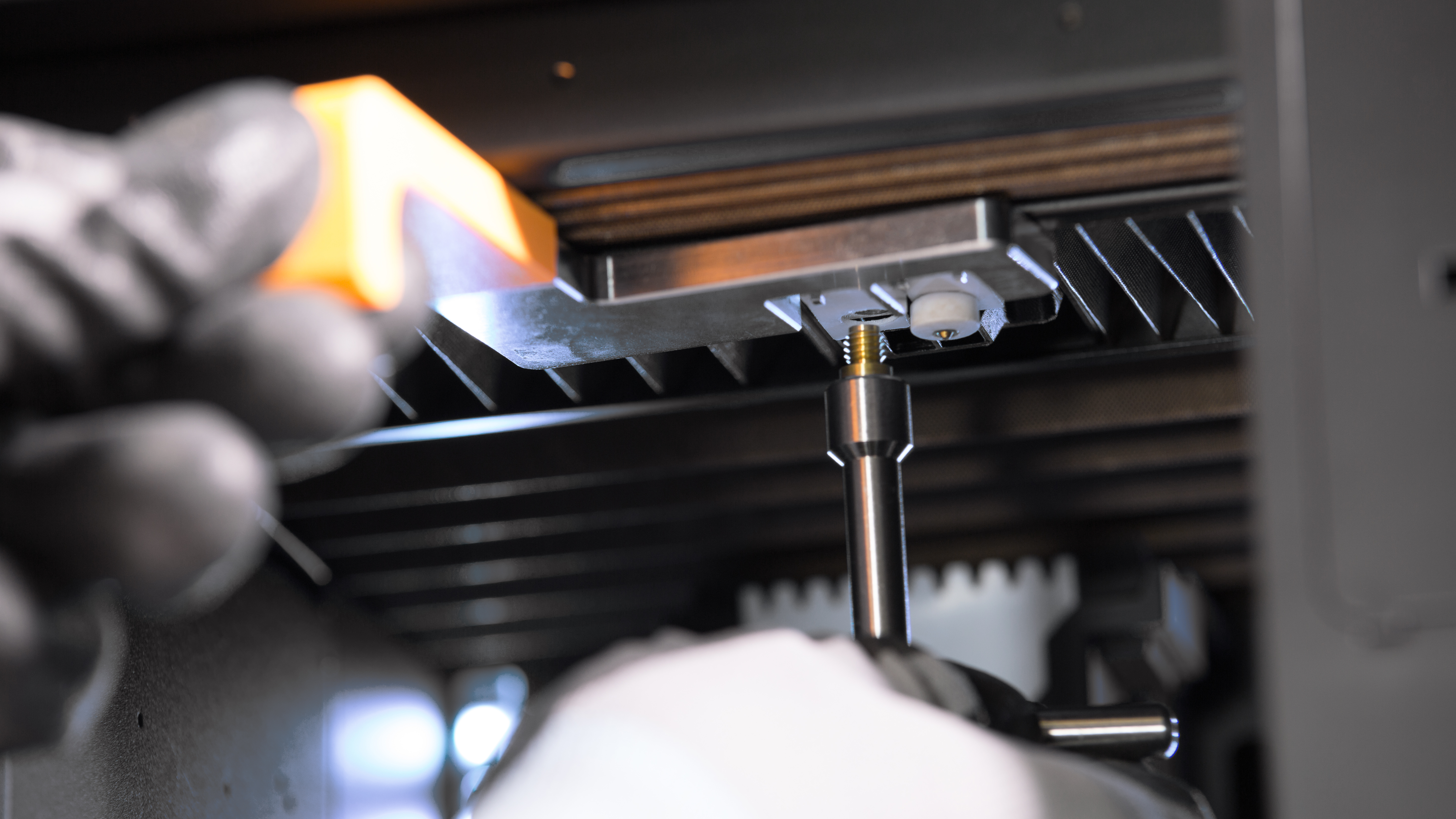Use the hotend maintenance tool to keep the hotends from moving and unscrew the nozzle counterclockwise using the nozzle key (when viewed from below). Removing the nozzle should take place while the extruder is still hot. When the nozzle is loose, take it out using pliers and follow the instructions from the printer display panel.