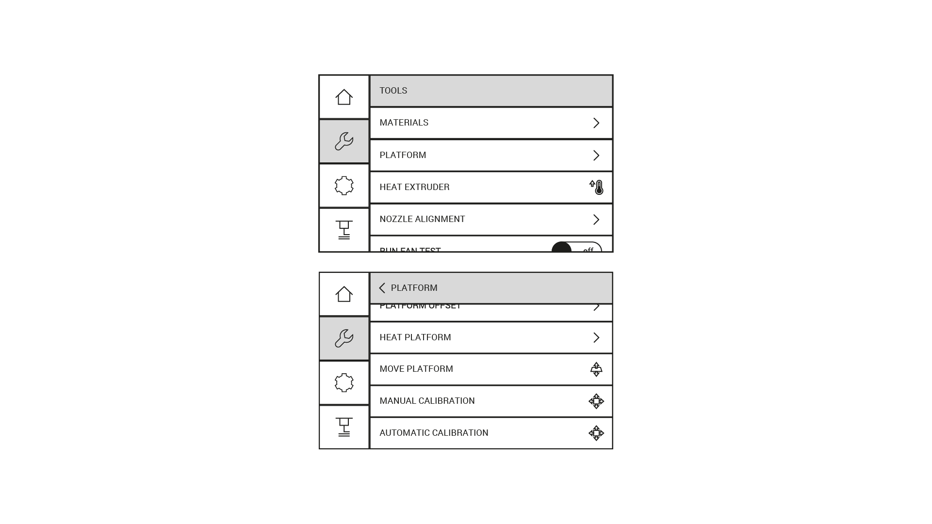 1. To calibrate the platform, select TOOLS, PLATFORM, and then AUTOMATIC CALIBRATION or MANUAL CALIBRATION (requires preparing paper in the A4 size) from the menu. Follow the instructions displayed on the screen.