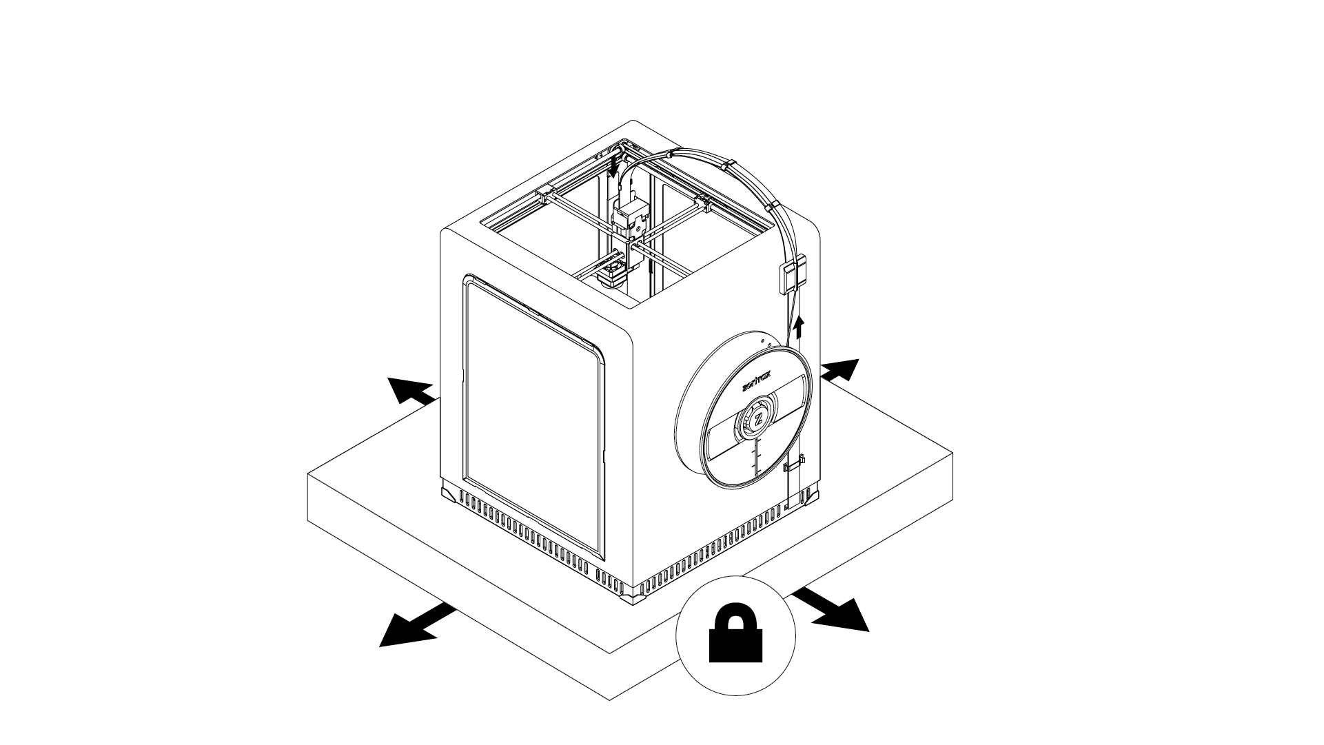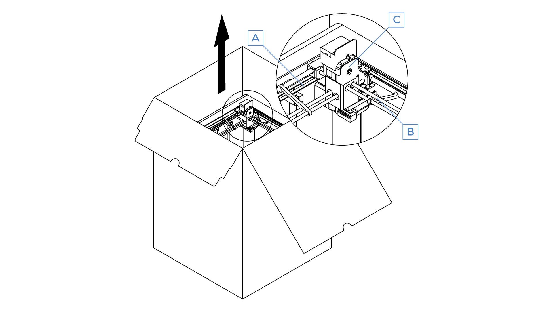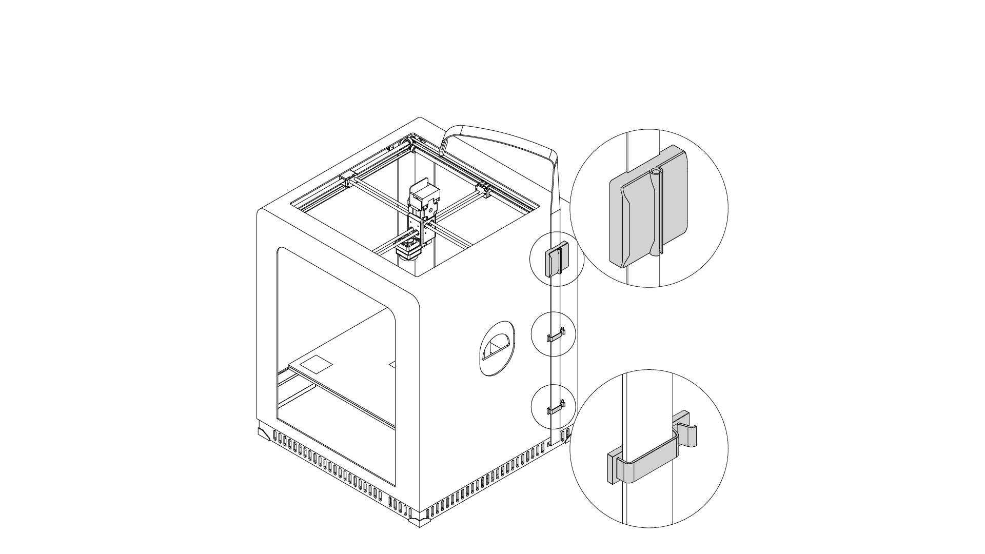 Take the 3D printer out of the box. Bearing in mind the printer’s weight (30kg), the M300 should be taken out of the box by two people.