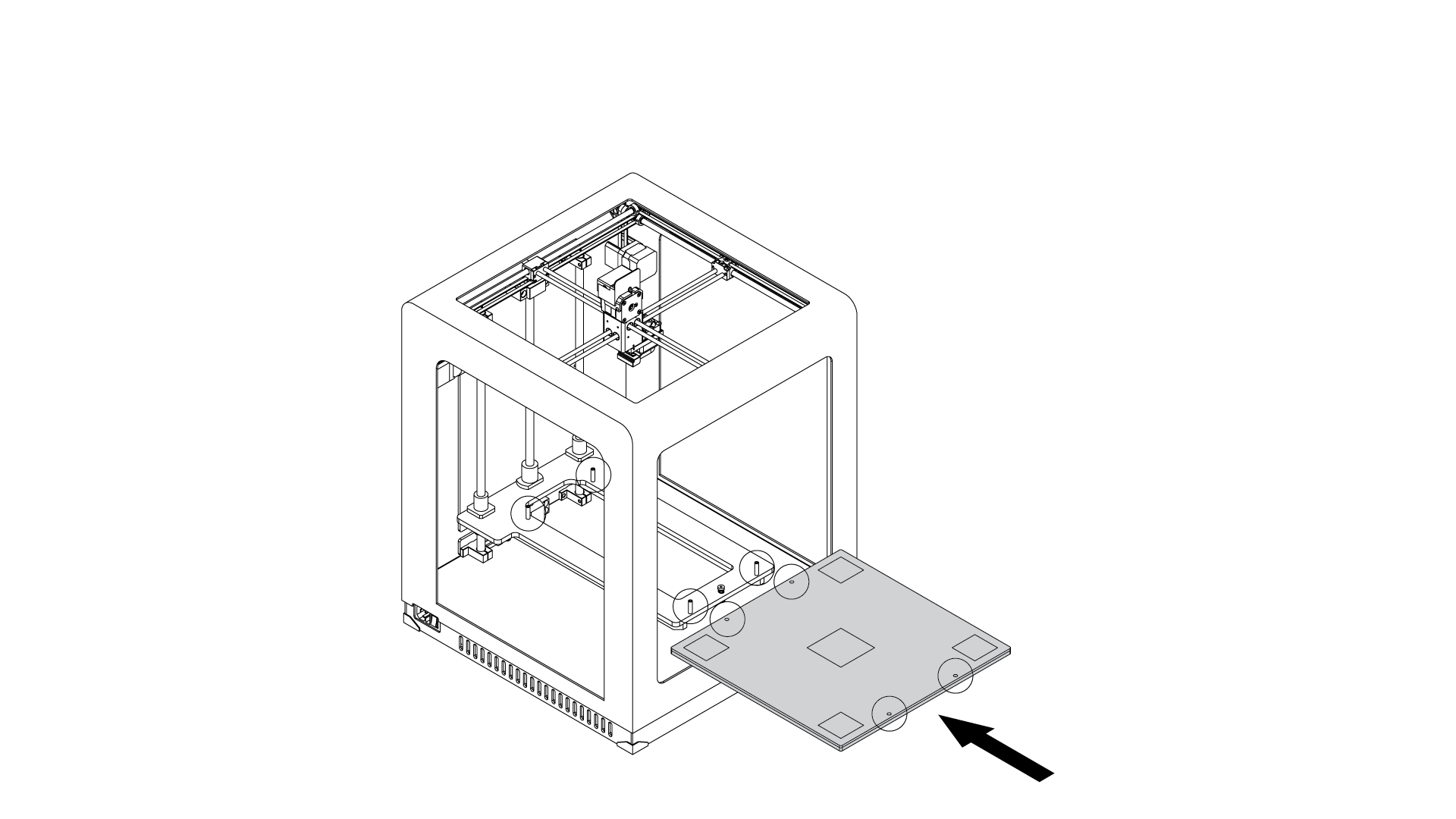 Install the build platform onto the bolts marked in the picture.