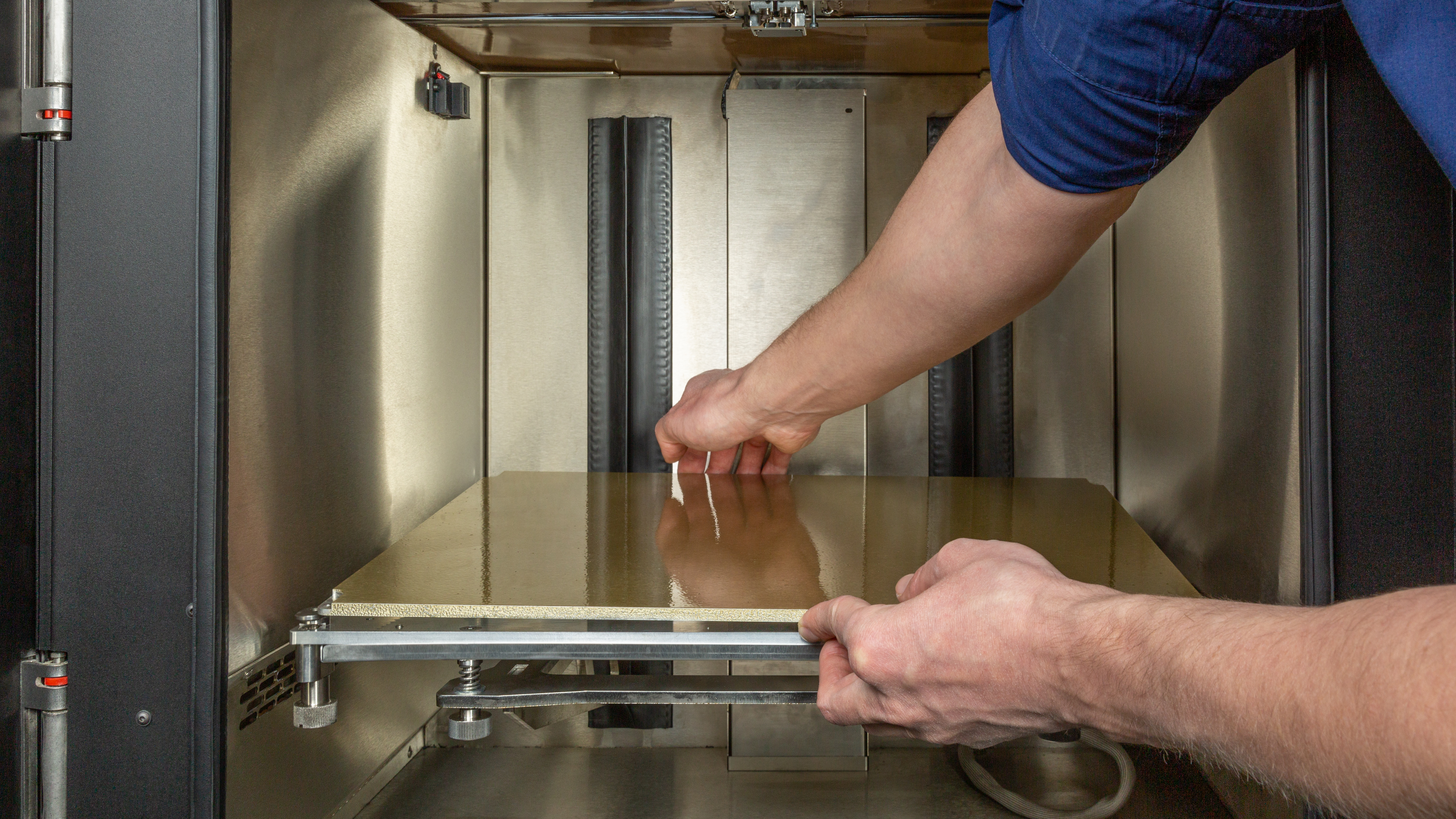 Loosen the four screws that secure the PEI plate, and turn the corner locks by 90°. Next, remove the plate.