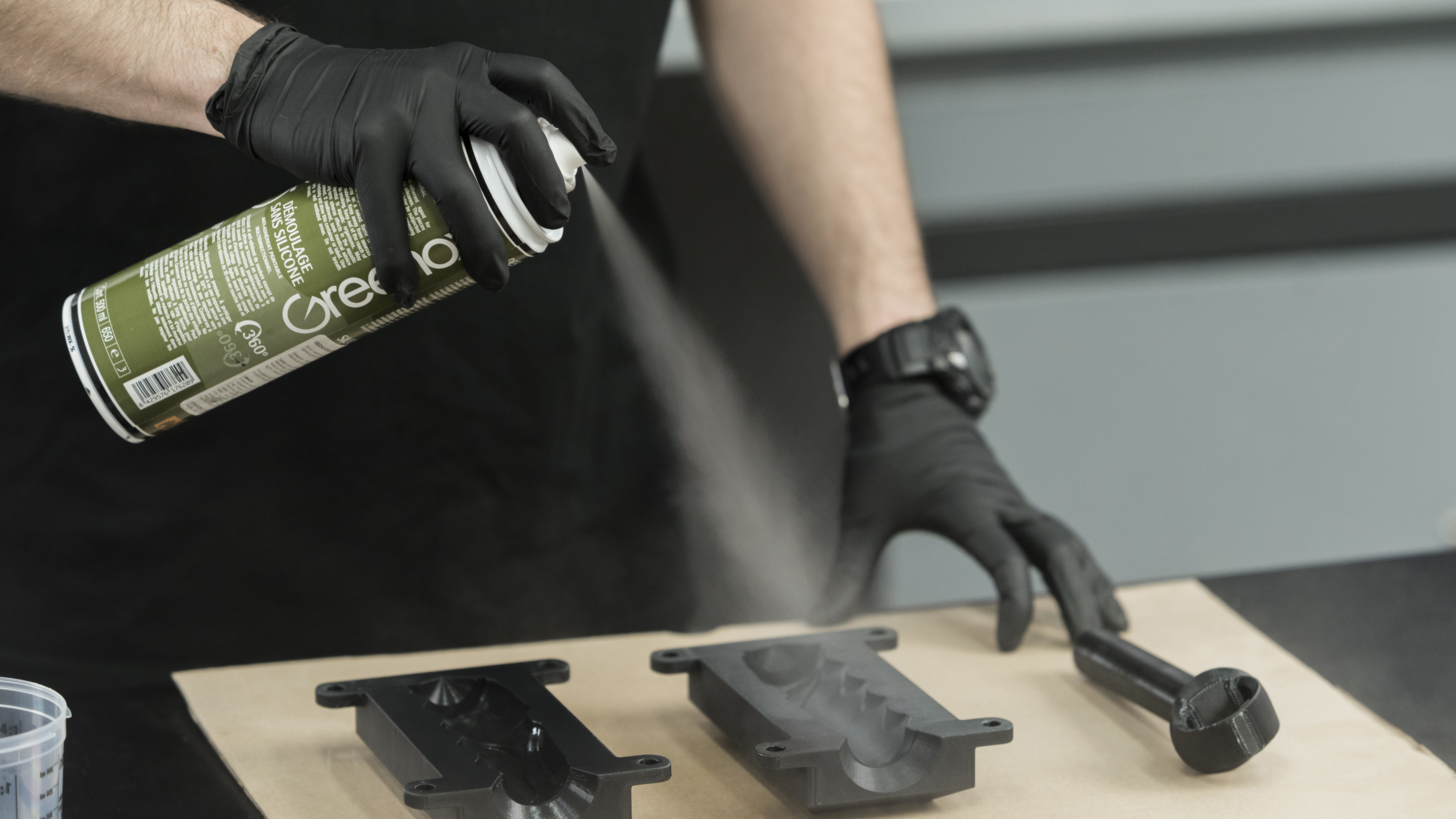 Spray some silicone on the inside of the mold to make sure the rubber elastomer won’t stick to it and the handle will be easily removable.