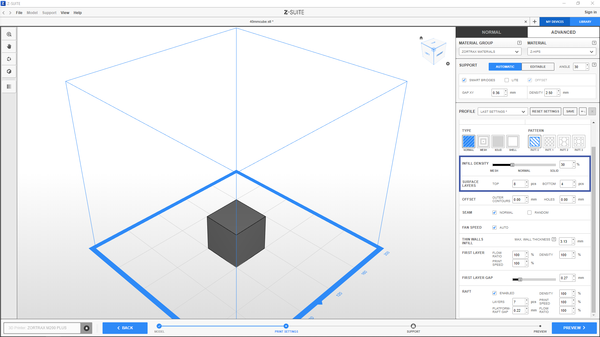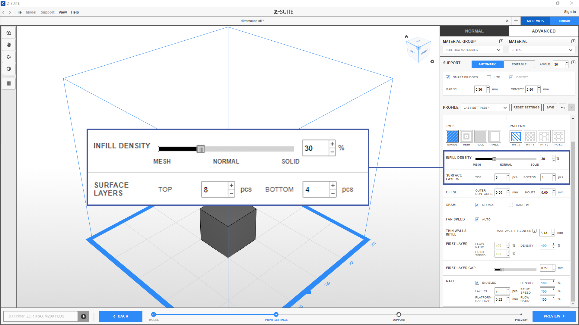Depending on the intended purpose of the object, you can adjust the infill settings in Z-SUITE. The software will automatically set the optimal number of top and bottom layers to ensure a proper quality model. Using the default option will ensure that the top and bottom surfaces of your model are properly closed.
