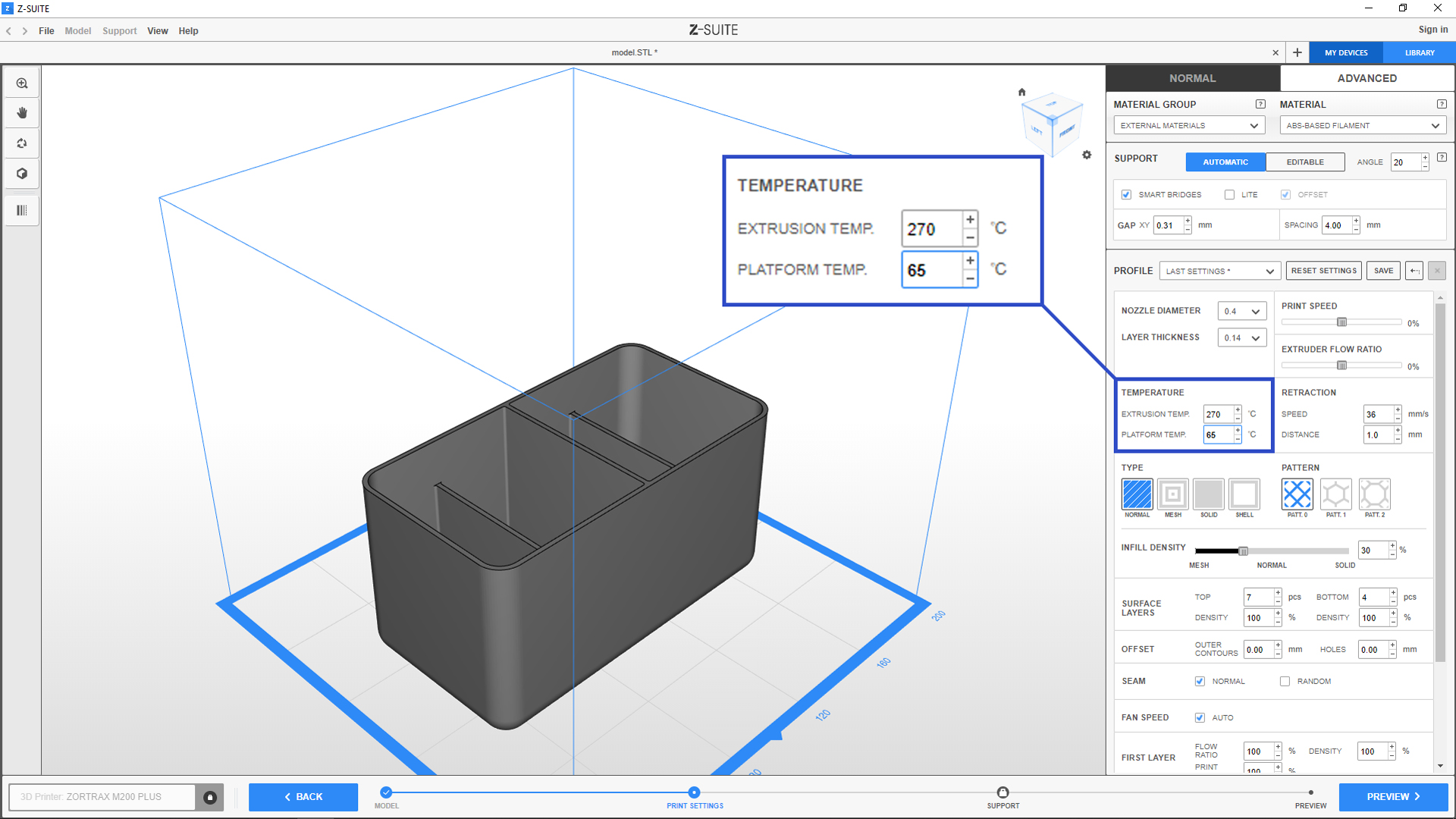 If you’re still having troubles with platform adhesion, try coating the perforated plate with Z-ABS juice. It is a mixture of Z-ABS and acetone, which you can prepare on your own. See the manual.