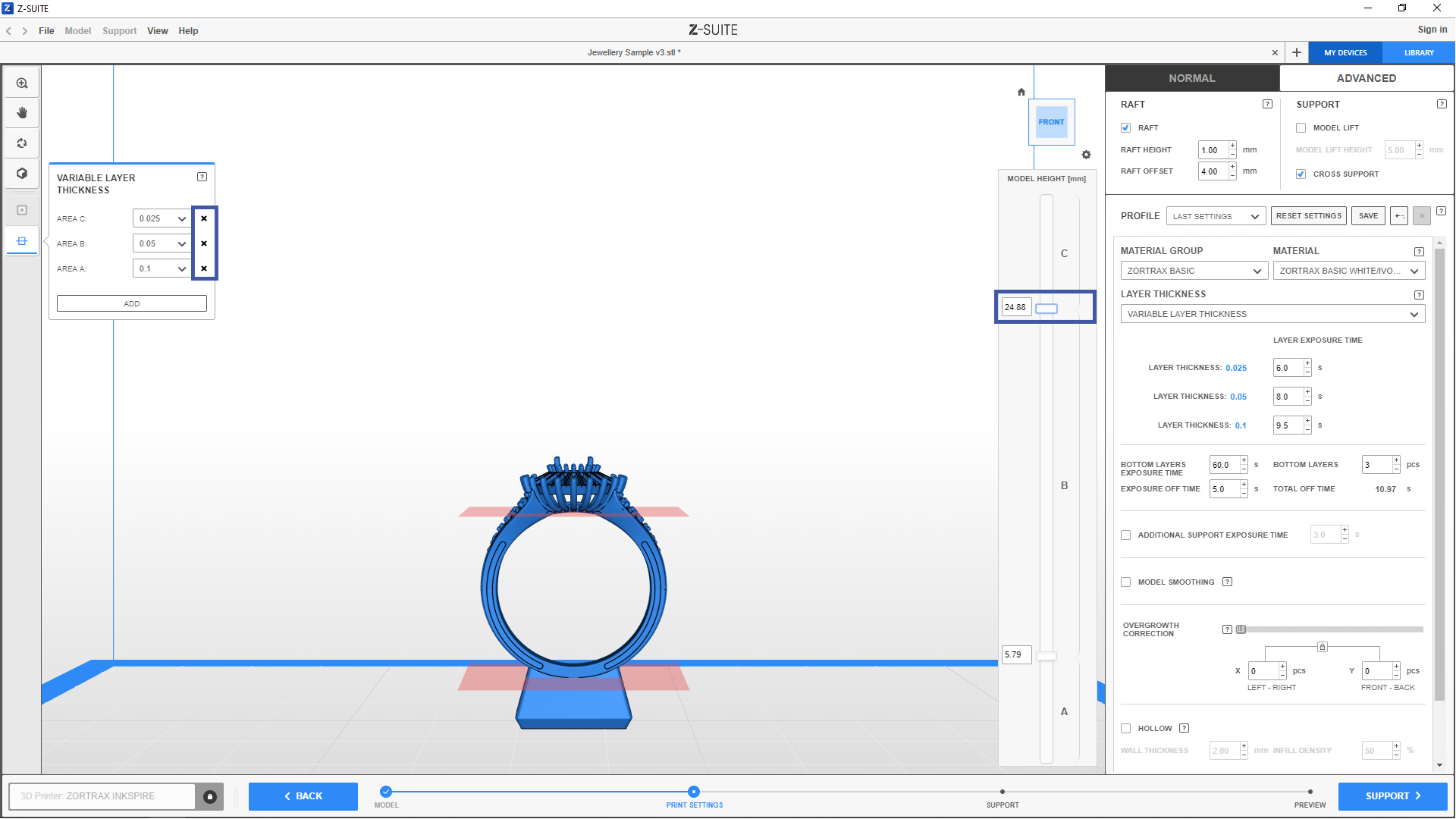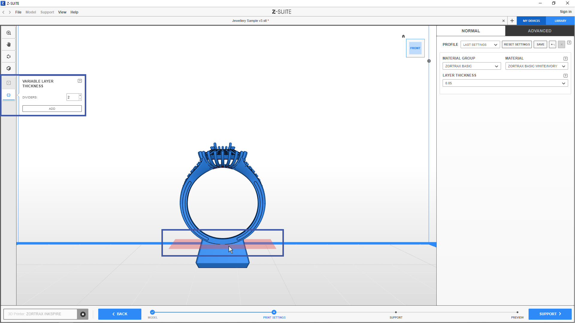 When preparing a model in Z-SUITE, select the last icon on the toolbar on the left to open the Variable Layer Thickness menu. You can add a number of dividers which split your model into areas, for example, with two dividers, your project will have three areas. In the small window on the left, you can set layer thickness settings for the selected areas, whereas in the Print settings menu on the right, you can set layer exposure time settings for these areas. Follow the steps described below to learn how to add and delete dividers, and to adjust settings.