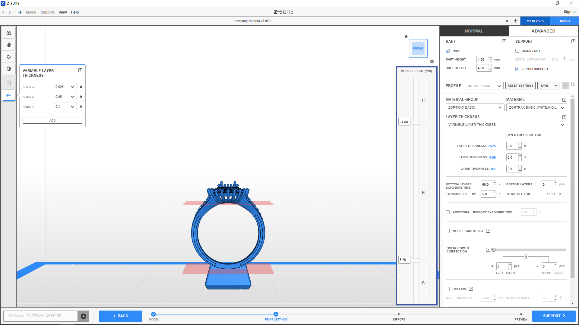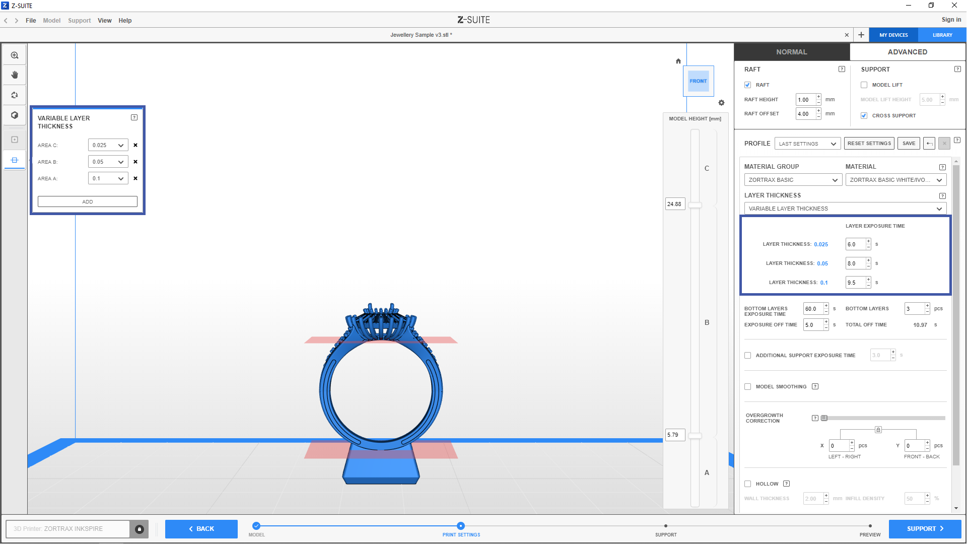 Remember that the same layer thickness values will have exactly the same layer exposure time settings, even when selected for different areas in your model.