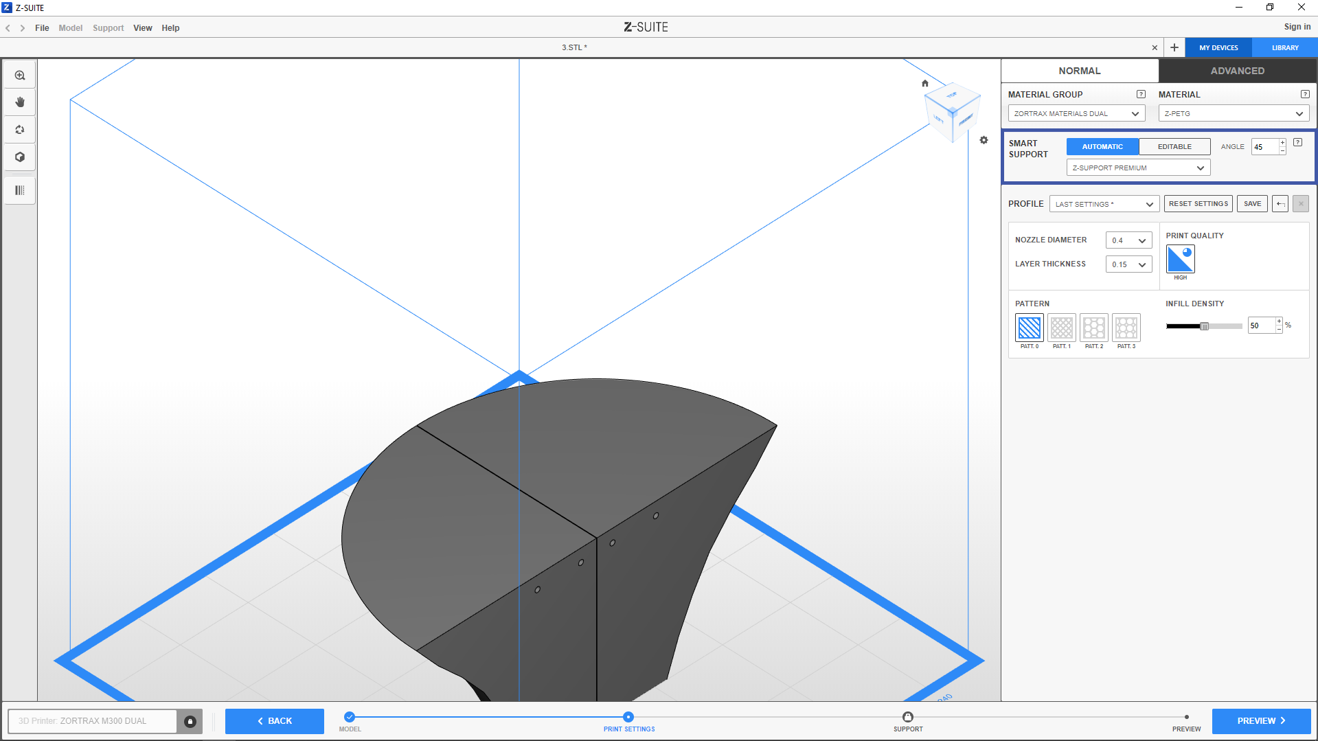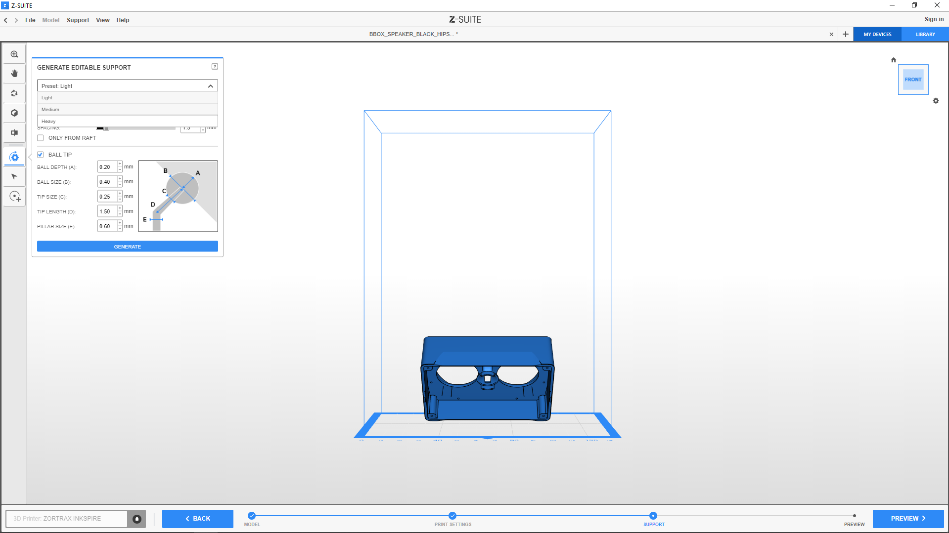 3. The Preset option allows you to customize the type of support to particular models. Light support is recommended for smaller prints, whereas Medium/Heavy support is recommended for prints with thick sections.