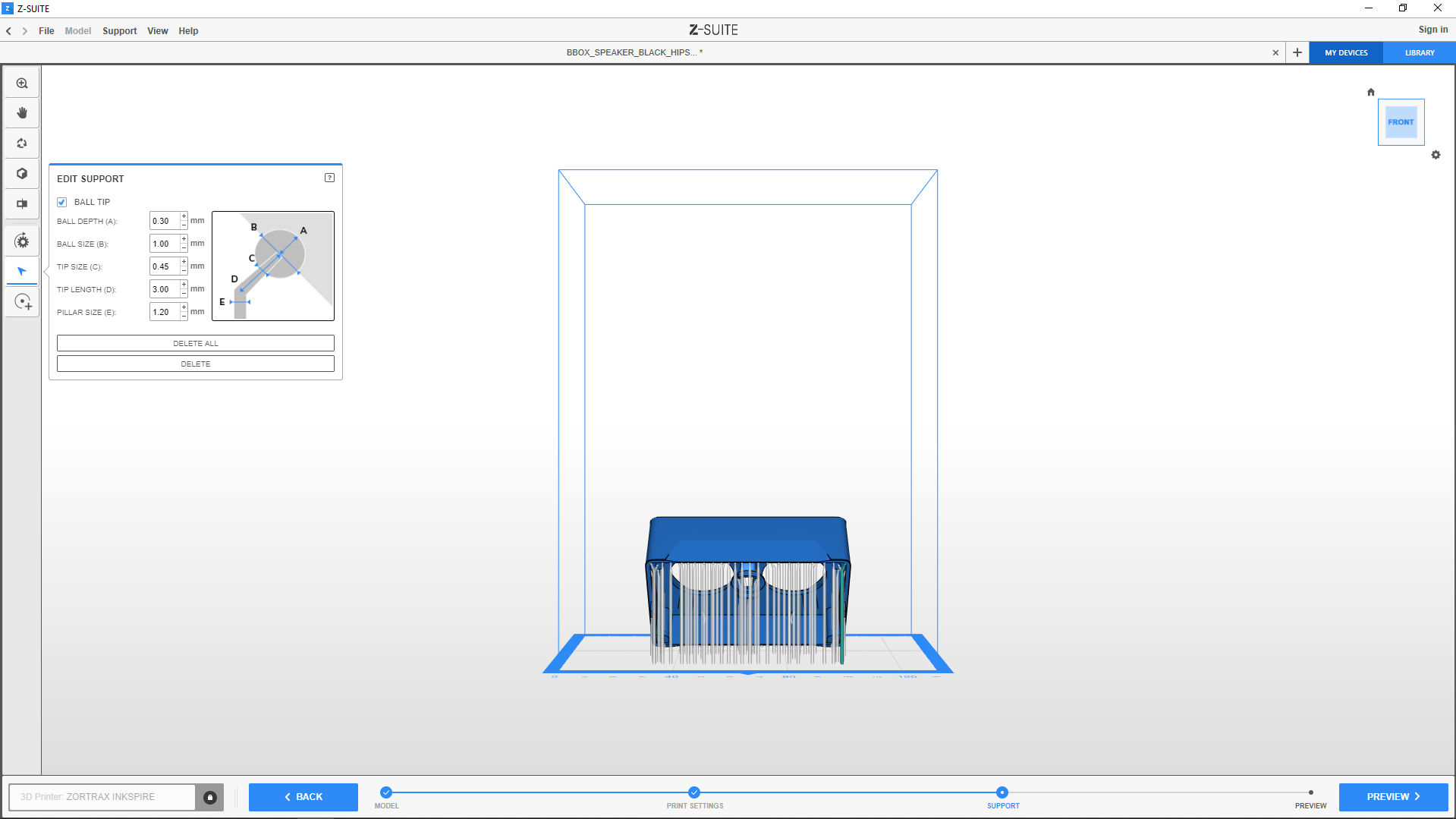 1. For the UV LCD technology, you can generate AUTOMATIC EDITABLE support in the Support step. In this technology, the support structures are in the form of pillars, each ended with a tip that adheres to the model and ensures that a model doesn’t fall into the resin tank during the printing process