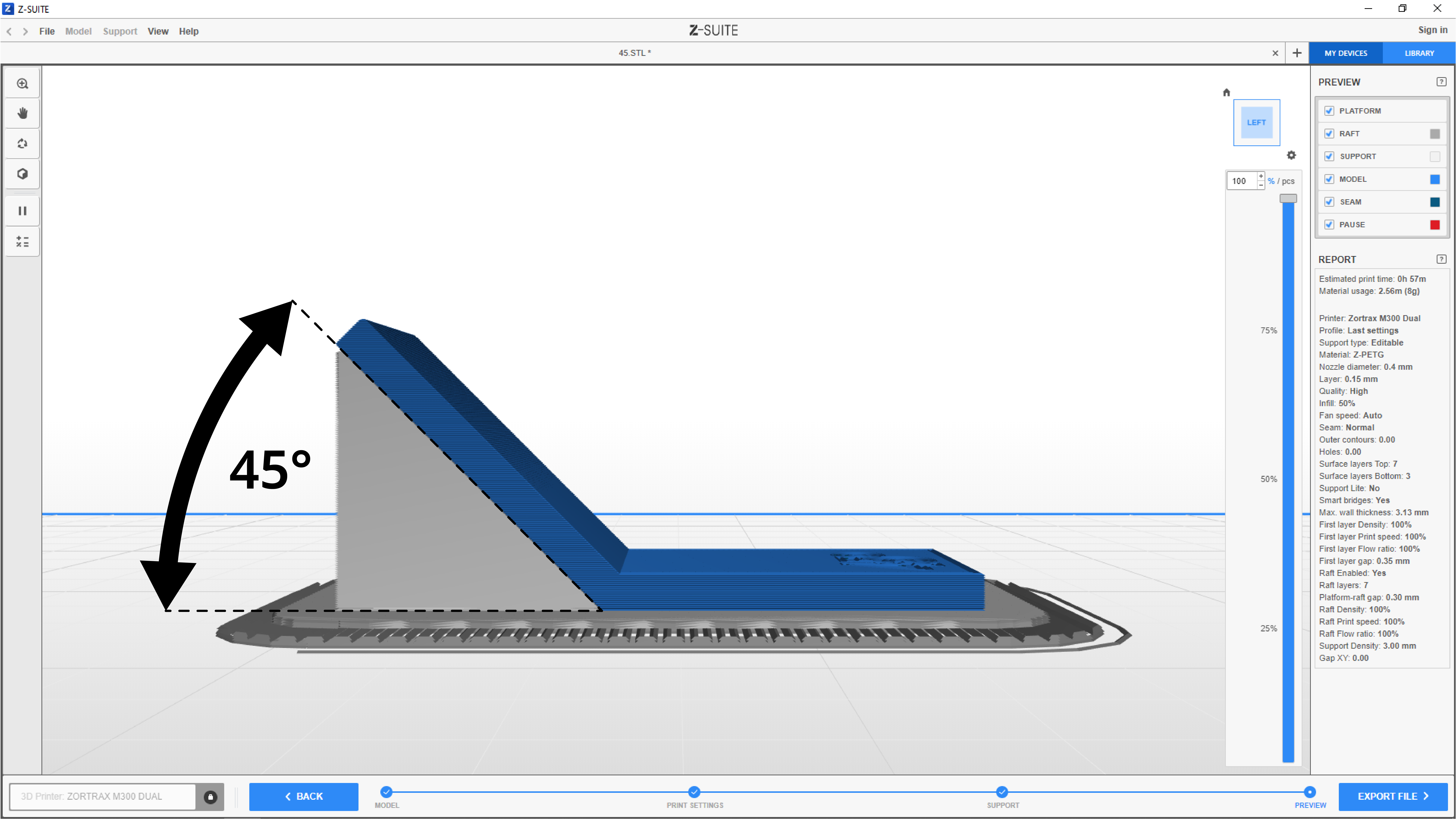 2. The GENERATE EDITABLE SUPPORT option automatically adds support structures to your model once you click GENERATE. You can adjust the angle at which the support should be generated. The default angle is 30° for the single-extrusion mode and 45° for the dual-extrusion mode.