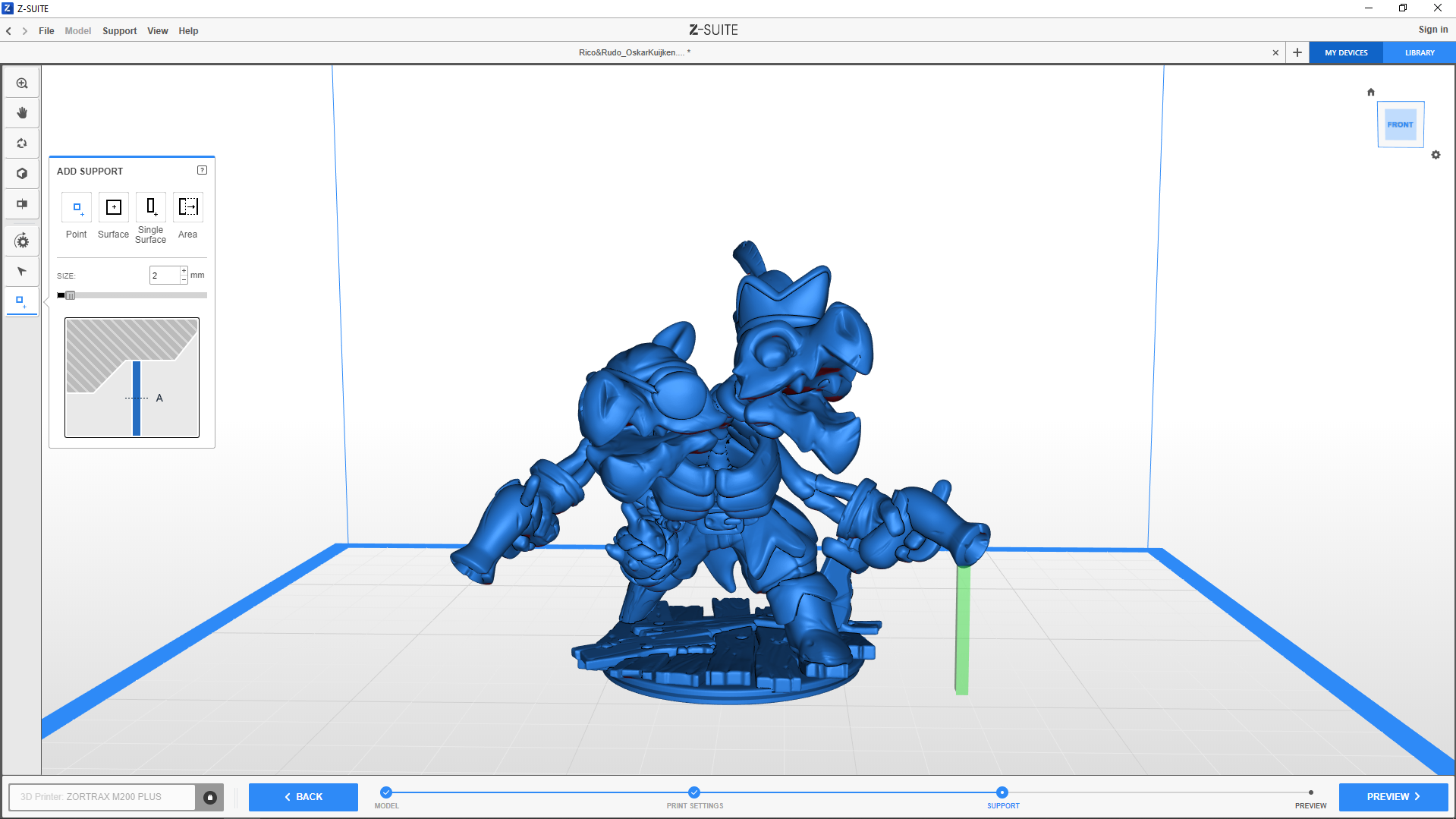 Area – adds a support block for a selected range of overhanging layers in a model. This type can be enlarged to surrounding layers with the Size option. It is particularly recommended for figurines and models with organic shapes.