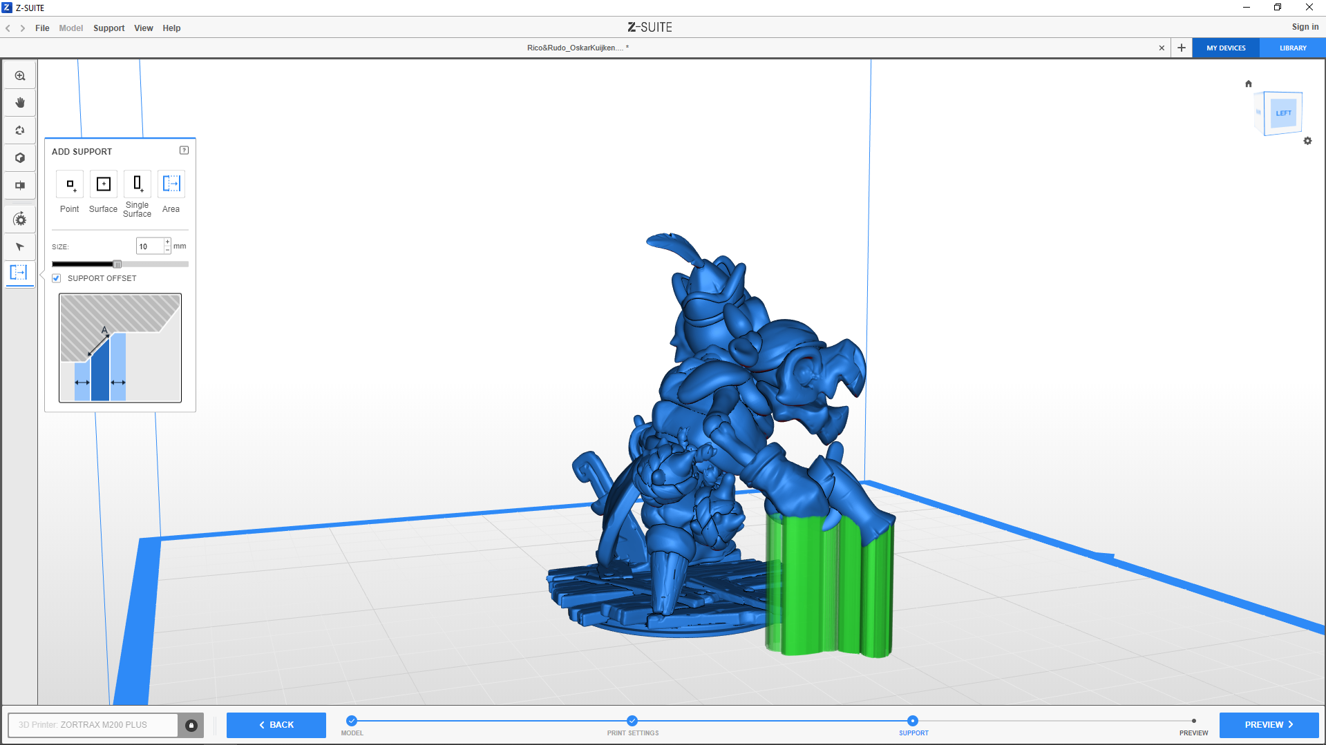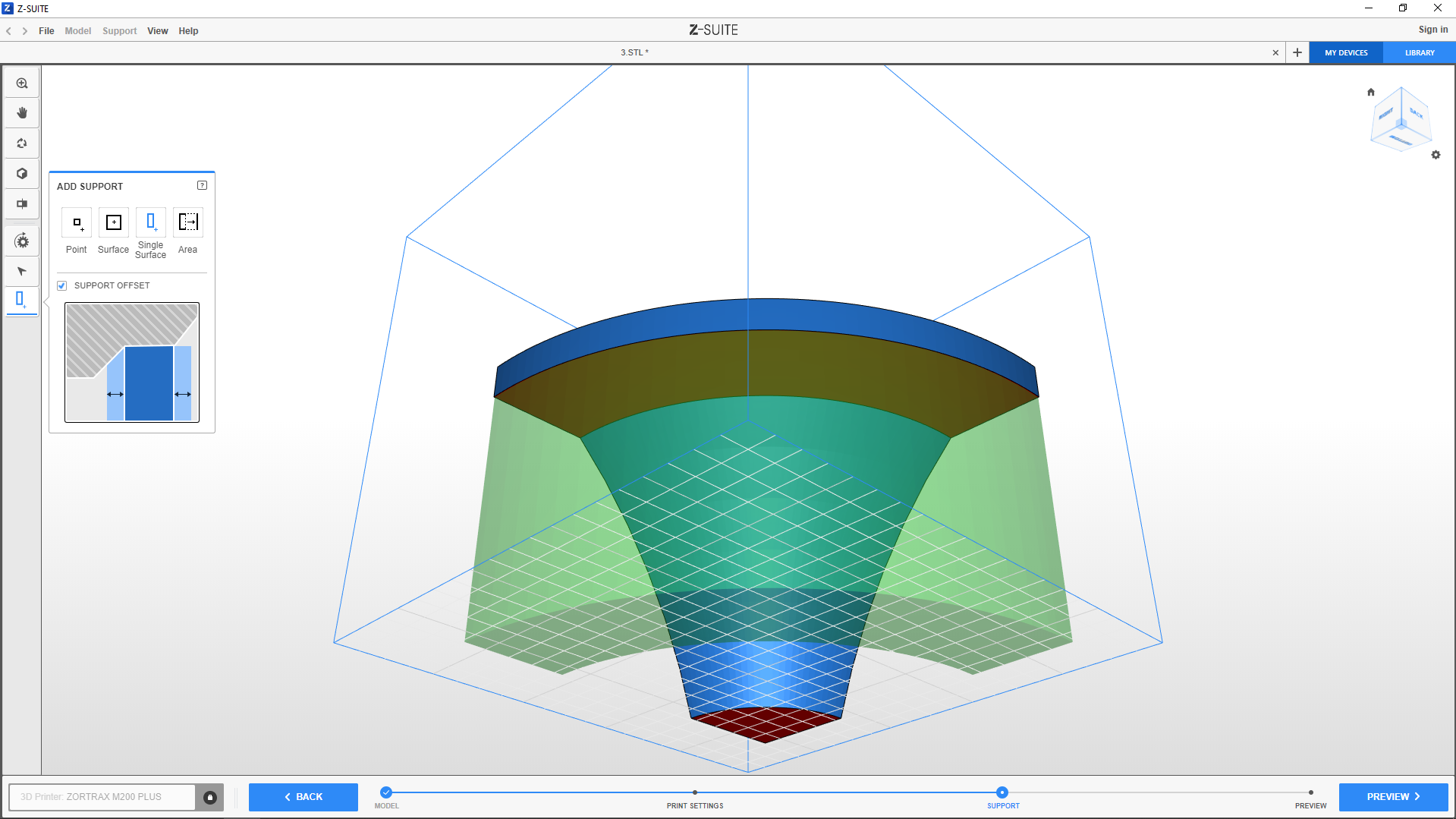 The Offset option (available for Surface, Single surface and Area type) enlarges the support structure, making it easier to remove. Support offset is useful when Z-SUITE generates the support in hard-to-reach areas, for example, holes and gaps.